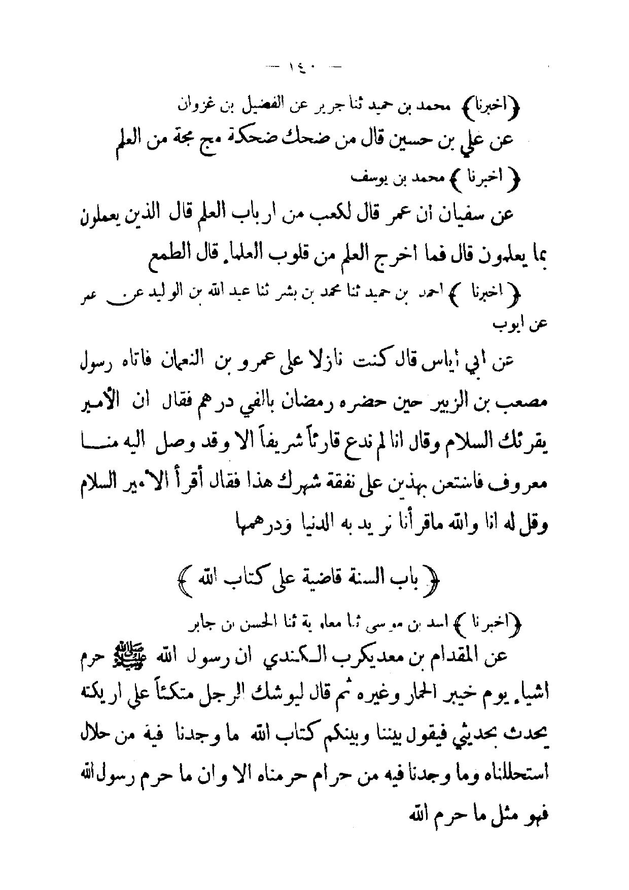 (أخبرنا) اسد بن موسى ثنا معاوية ثنا الحسن بن جابر عن المقدام بن معد يكرب الكندي ان رسول الله صلى الله عليه وسلم حرم اشياء يوم خيبر الحمار وغيره ثم قال ليوشك الرجل متكئا على اريكته يحدث بحديثي فيقول بيننا وبينكم كتاب الله ما وجدنا فيه من حلال استحللناه وما وجدنا فيه من حرام حرمناه الا وان ما حرم رسول الله فهو مثل ما حرم الله