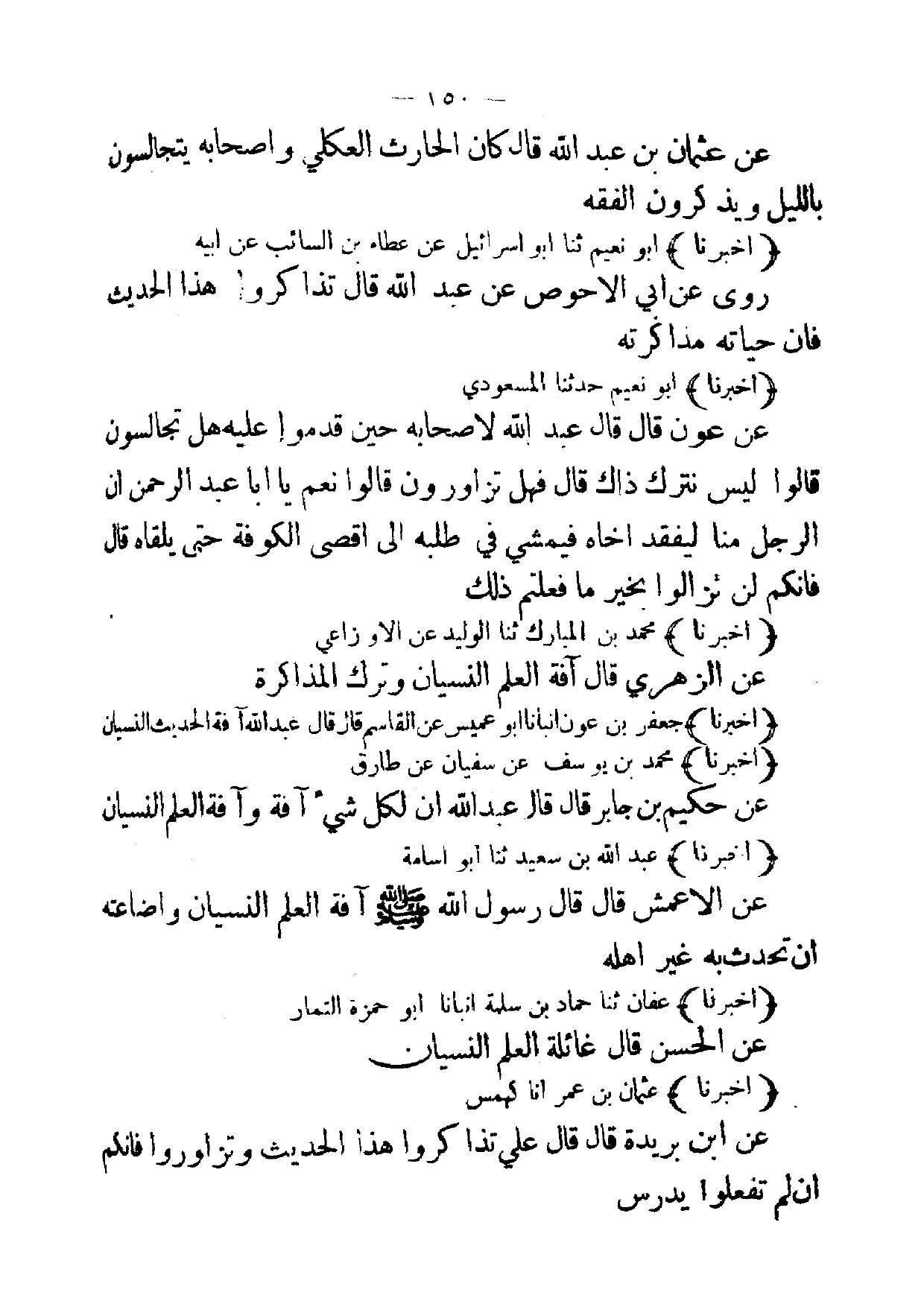 [ 150 ] عن عثمان بن عبد الله قال كان الحارث العكلي واصحابه يتجالسون بالليل ويذكرون الفقه