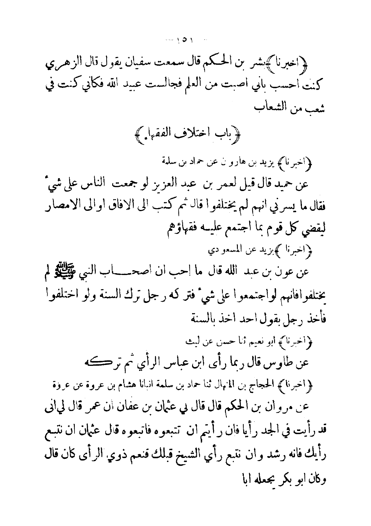 (أخبرنا) يزيد بن هارون عن حماد بن سلمة عن حميد قال قيل لعمر بن عبد العزيز لو جمعت الناس على شئ فقال ما يسرني انهم لم يختلفوا قال ثم كتب إلى الافاق أو إلى الامصار ليقضي كل قوم بما اجتع عليه فقهاؤهم