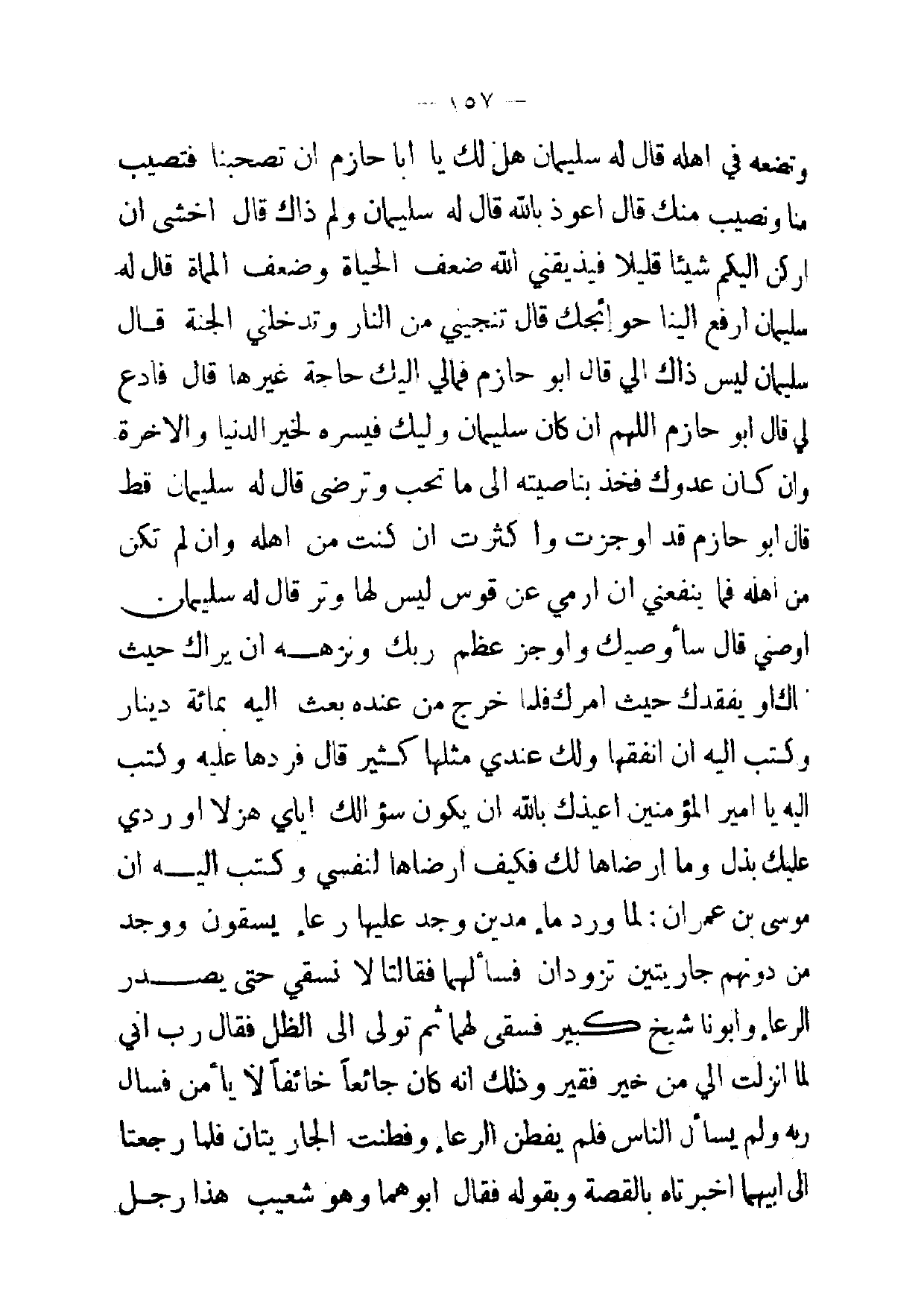 [ 157 ] وتضعه في اهله قال له سليمان هل لك يا ابا حازم ان تصحبنا فتصيب منا ونصيب منك قال اعوذ بالله قال له سليمان ولم ذاك قال اخشى ان اركن اليكم شيئا قليلا فيذيقني الله ضعف الحياة وضعف المماة قال له سليمان ارفع الينا حوائجك قال اتنجيني من النار وتدخلني الجنة قال سليمان ليس ذاك الي قال أبو حازم فمالي اليك حاجة غيرها قال فادع لي قال أبو حازم اللهم ان كان سليمان وليك فيسره لخير الدنيا والاخرة وان كان عدوك فخذ بناصيته إلى ما تحب وترضى قال له سليمان قط قال أبو حازم قد اوجزت واكثرت ان كنت من اهله وان لم تكن من اهله فما ينفعني ان ارمي عن قوس ليس لها وتر قال له سليمان اوصني قال سأوصيك واوجز عظم ربك نزهه ان يراك حيث ؟ ؟ أو يفقدك حيث امرك فلما خرج من عنده بعث إليه بمائة دينار وكتب إليه ان انفقها ولك عندي مثلها كثير قال فردها عليه وكتب إليه يا امير المؤمنين اعيذك بالله ان يكون سؤالك اياي هزلا أو ردي عليك بذل وما ارضاها لك فكيف ارضاها لنفسي وكتب إليه ان موسى بن عمران : لما ورد ماء مدين وجد عليها رعاء يسقون ووجد من دونهم جاريتين تزودان فسألهما فقالتا لا نسقي حتى يصدر الرعاء وابونا شيخ كبير فسقى لهما ثم تولى إلى الظل فقال رب اني لما انزلت الي من خير فقير وذلك انه كان جائعا خائفا لا يأمن فسال ربه ولم يسأل الناس فلم يفطن الرعاء وفطنت الجاريتان فلما رجعتا إلى ابيهما اخبرتاه بالقصة وبقوله فقال ابوهما وهو شعيب هذا رجل