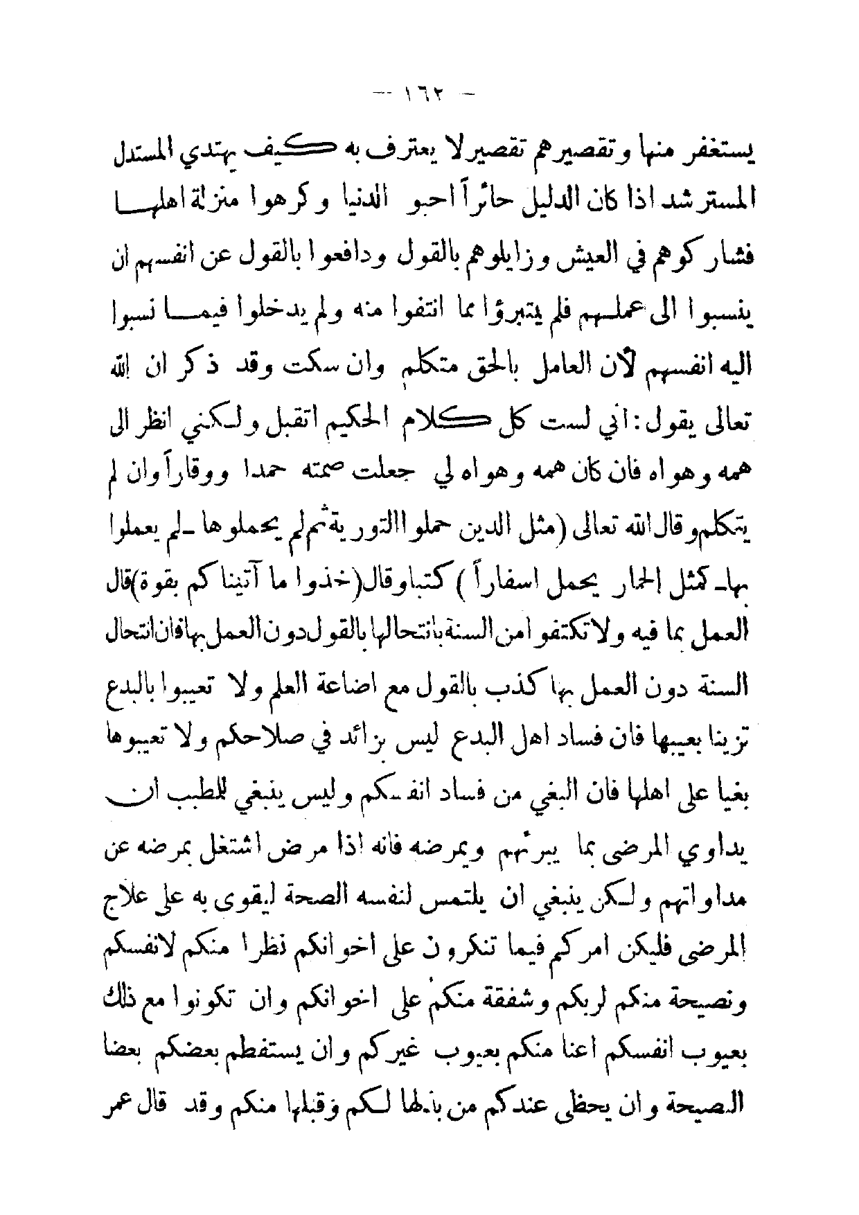 [ 162 ] يستغفر منها وتقصيرهم تقصير لا يعترف به كيف يهتدي المستدل المسترشد إذا كان الدليل حائرا احبوا الدنيا وكرهوا منزلة اهلها فشاركوهم في العيش وزايلوهم بالقول ودافعوا بالقول عن انفسهم ان ينسبوا إلى عملهم فلم يتبرؤا مما انتفوا منه ولم يدخلوا فيما نسبوا إليه انفسهم لان العامل بالحق متكلم وان سكت وقد ذكر ان الله تعالى يقول : اني لست كل كلام الحكيم اتقبل ولكني انظر إلى همه وهواه فان كان همه وهواه لي جعلت صمته حمدا ووقارا وان لم يتكلم وقال الله تعالى (مثل الدين حملوا التورية ثم لم يحملوها - لم يعملوا بها - كمثل الحمار يحمل اسفارا) كتبا وقال (خذوا ما آتينا كم بقوة) قال العمل بما فيه ولا تكتفوا من السنة بانتحالها بالقولدون العمل بها فان انتحال السنة دون العمل بها كذب بالقول مع اضاعة العلم ولا تعيبوا بالبدع تزينا بعيبها فان فساد اهل البدع ليس بزائد في صلاحكم ولا تعيبوها بغيا على اهلها فان البغي من فساد انفسكم وليس ينبغي للمطبب ان يداوي المرضى بما يبرئهم ويمرضه فانه إذا مرض اشتغل بمرضه عن مداو اتهم ولكن ينبغي ان يلتمس لنفسه الصحة ليقوى به على علاج المرضى فليكن امركم فيما تنكرون على اخوانكم نظرا منكم لانفسكم ونصيحة منكم لربكم وشفقة منكم على اخوانكم وان تكونوا مع ذلك بعيوب انفسكم اعنا منكم بعيوب غيركم وان يستفطم بعضكم بعضا الصيحة وان يحظى عندكم من بذلها لكم وقبلها منكم وقد قال عمر