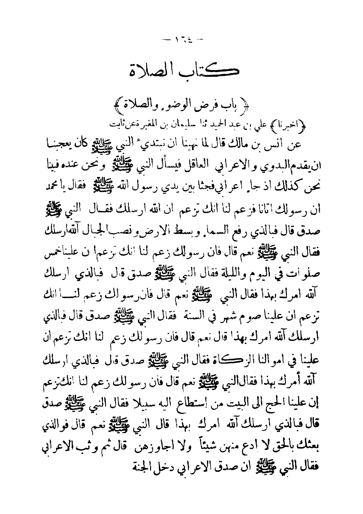 (أخبرنا) علي بن عبد الحميد ثنا سليمان بن المغيرة عن ثابت عن انس بن مالك قال لما نهينا ان نبتدئ النبي صلى الله عليه وسلم كان بعجبنا ان يقدم البدوي والاعرابي العاقل فيسأل النبي صلى الله عليه وسلم ونحن عنده فبينا نحن كذلك إذ جاء اعرابي فجثا بين يدي رسول الله صلى الله عليه وسلم فقال يا محمد ان رسولك اتانا فزعم لنا انك تزعم ان الله ارسلك فقال النبي صلى الله عليه وسلم صدق قال فبالذي رفع السماء وبسط الارض ونصب الجبال آلله ارسلك فقال النبي صلى الله عليه وسلم نعم قال فان رسولك زعم لنا انك تزعم ان علينا خمس صلوات في اليوم والليلة فقال النبي صلى الله عليه وسلم صدق قال فبالذي ارسلك آلله امرك بهذا فقال النبي صلى الله عليه وسلم نعم قال فان رسولك زعم لنا انك تزعم ان علينا صوم شهر في السنة فقال النبي صلى الله عليه وسلم صدق قال فبالذي ارسلك آلله امرك بهذا قال نعم قال فان رسولك زعم لنا انك تزعم ان علينا في اموالنا الزكاة فقال النبي صلى الله عليه وسلم صدق قال فبالذاي ارسلك آلله أمرك بهذا فقال النبي صلى الله عليه وسلم نعم قال فان رسولك زعم لنا انك تزعم إن علينا الحج إلى البيت من استطاع إليه سبيلا فقال النبي صلى الله عليه وسلم صدق قال فبالذي ارسلك الله امرك بهذا قال النبي صلى الله عليه وسلم نعم قال فو الذي بعثك بالحق لا ادع منهن شيئا ولا اجاوزهن قال ثم وثب الاعرابي فقال النبي صلى الله عليه وسلم ان صدق الاعرابي دخل الجنة