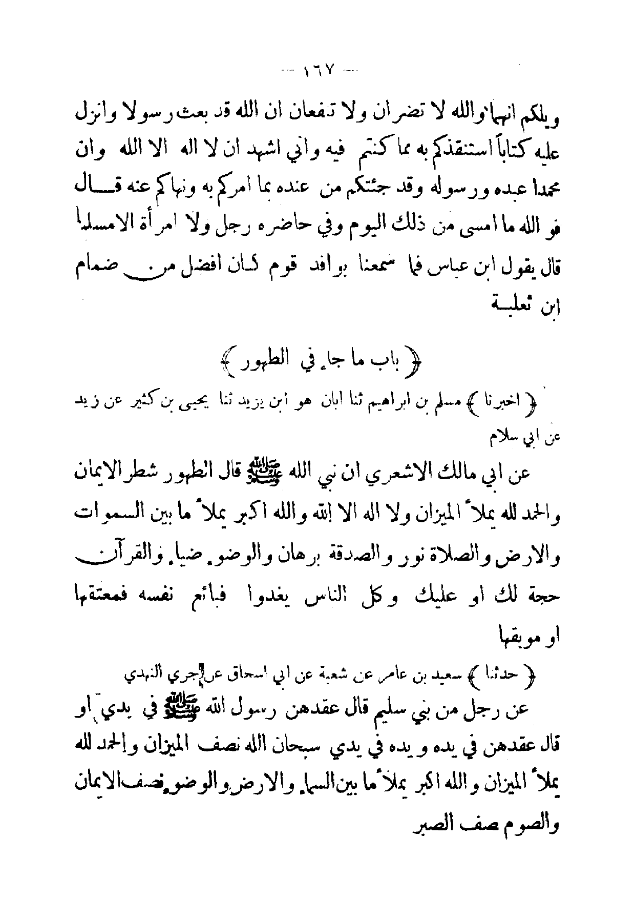 (حدثنا) سعيد بن عامر عن شعبة عن ابي اسحاق عن جري النهدي عن رجل من بني سليم قال عقدهن رسول الله صلى الله عليه وسلم في يدي أو قال عقدهن في يده ويده في يدي سبحان الله نصف الميزان والحمد لله يملا الميزان والله اكبر يملا ما بين السماء والارض والوضوء نصف الايمان والصوم نصف الصبر