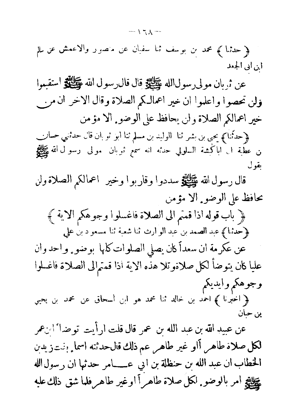 (حدثنا) محمد بن يوسف ثنا سفيان عن منصور والاعمش عن سالم ابن ابى الجعد عن ثوبان مولى رسول الله صلى الله عليه وسلم قال قال رسول الله صلى الله عليه وسلم استقيموا ولن تحصوا واعلموا ان خير اعمالكم الصلاة وقال الاخر ان من خير اعمالكم الصلاة ولن يحافظ على الوضوء الامؤمن