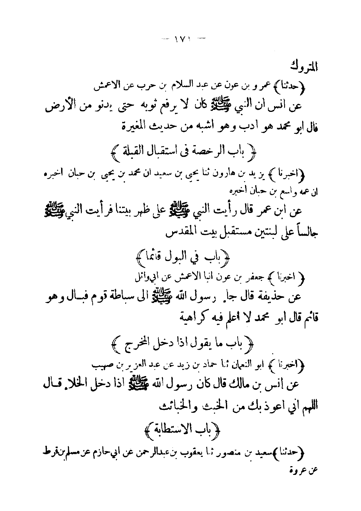 (حدثنا) عمرو بن عون عن عبد السلام بن حرب عن الاعمش عن انس ان النبي صلى الله عليه وسلم كان لا يرفع ثوبه حتى يدنو من الارض فال أبو محمد هو ادب وهو اشبه من حديث المغيرة