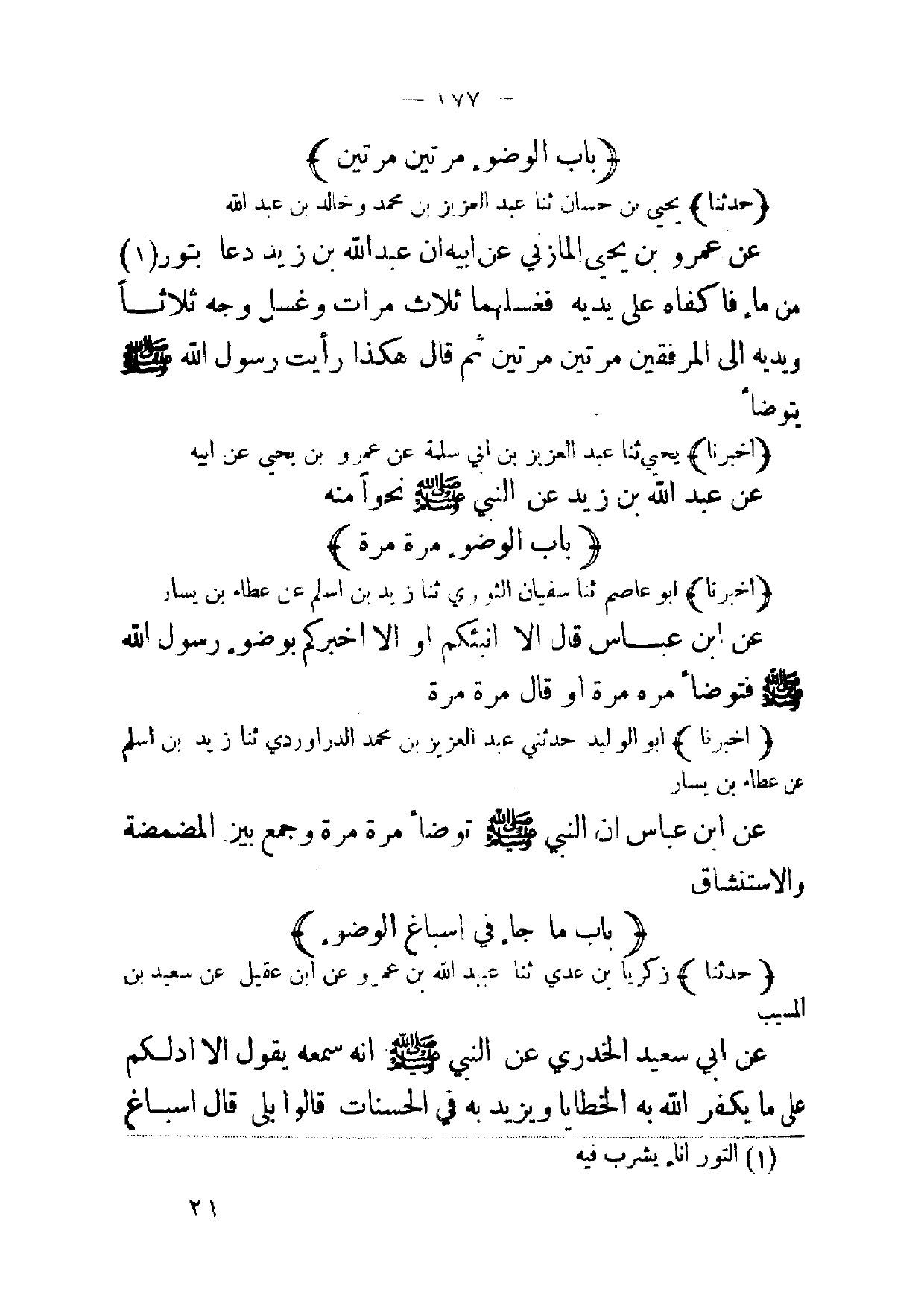 (حدثنا) يحيى بن حسان ثنا عبد العزيز بن محمد وخالد بن عبد الله عن عمرو بن يحيى المازني عن ابيه ان عبد الله بن زيد دعا بتور (1) من ماء فاكفأه على يديه فغسلهما ثلاث مرات وغسل وجه ثلاثا ويديه إلى المرفقين مرتين مرتين ثم قال هكذا رأيت رسول الله صلى الله عليه وسلم يتوضأ