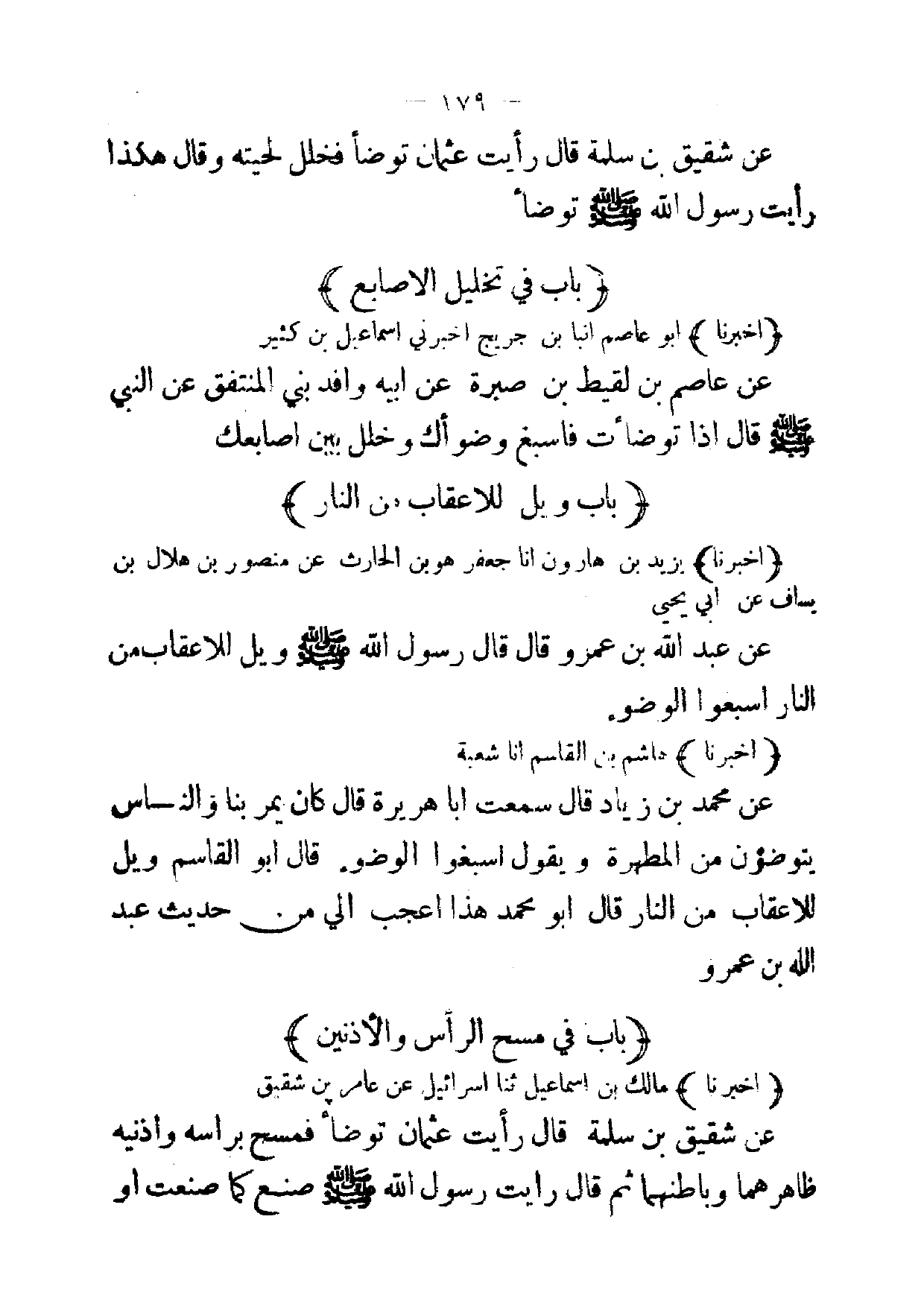 [ 179 ] عن شقيق بن سلمة قال رأيت عثمان توضأ فخلل لحيته وقال هكذا رأيت رسول الله صلى الله عليه وسلم توضأ