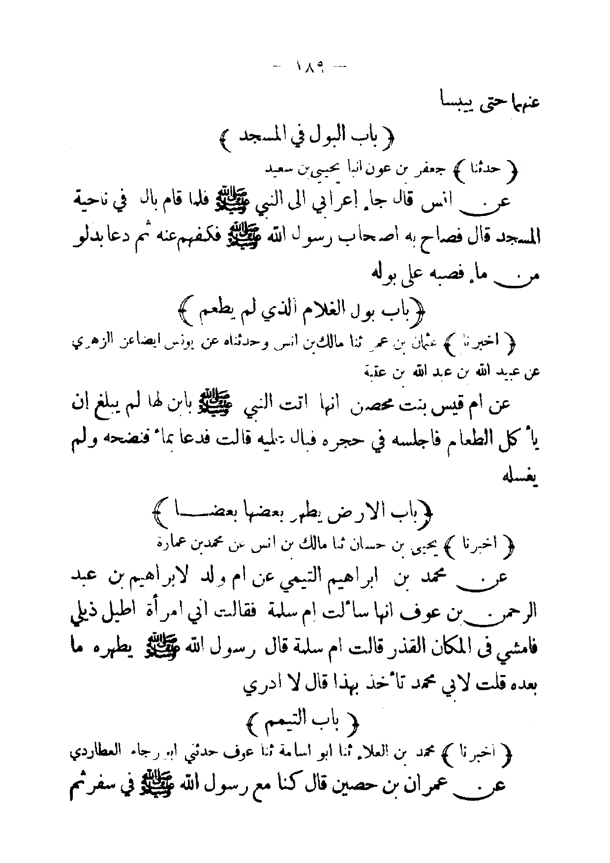 (أخبرنا) عثمان بن عمر ثنا مالك بن انس وحدثناه عن يونس ايضا عن الزهري عن عبيدالله بن عبد الله بن عتبة عن ام قيس بنت محصن انها اتت النبي صلى الله عليه وسلم بابن لها لم يبلغ ان يأكل الطعام فاجلسه في حجره فبال عليه قالت فدعا بماء فنضحه ولم يغسله