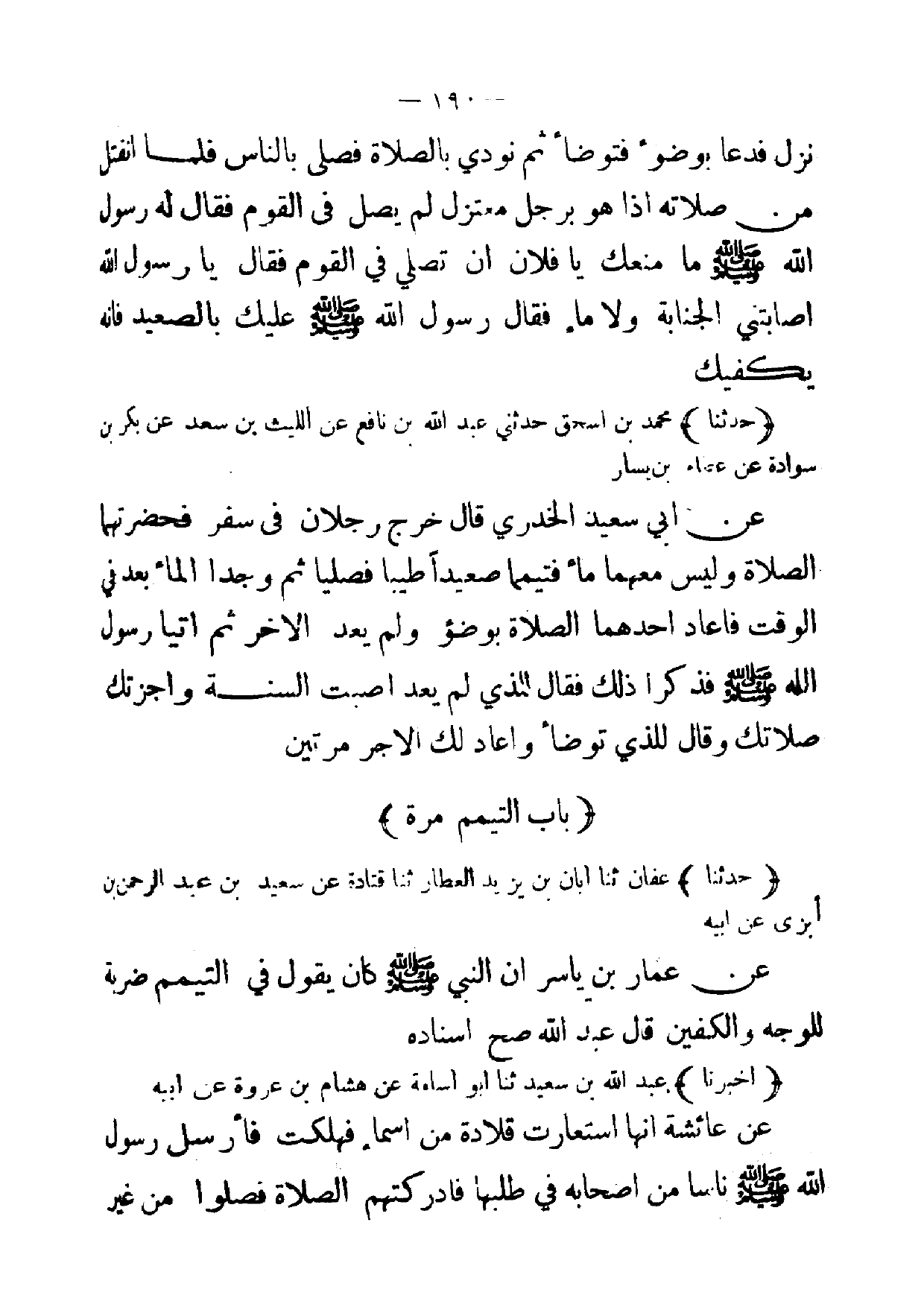 [ 190 ] نزل فدعا بوضوء فتوضأ ثم نودي بالصلاة فصلى بالناس فلما انفتل من صلاته إذا هو برجل معتزل لم يصل في القوم فقال له رسول الله صلى الله عليه وسلم ما منعك يا فلان ان تصلي في القوم فقال يا رسول الله اصابتني الجنابة ولا ماء فقال رسول الله صلى الله عليه وسلم عليك بالصعيد فانه يكفيك