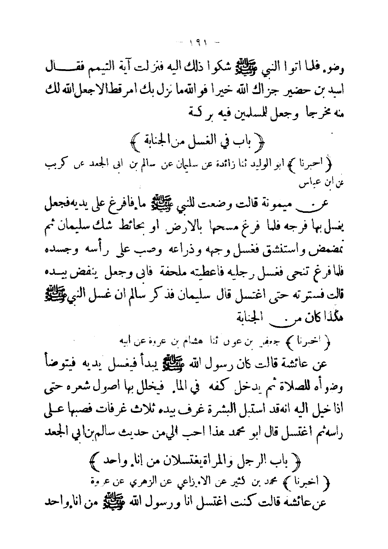 [ 191 ] وضوء فلما اتوا النبي صلى الله عليه وسلم شكوا ذلك إليه فنزلت آية التيمم فقال اسيد بن حضير جزاك الله خيرا فوالله ما نزل بك امر قطا لا جعل الله لك منه مخرجا وجعل للمسلمين فيه بركة