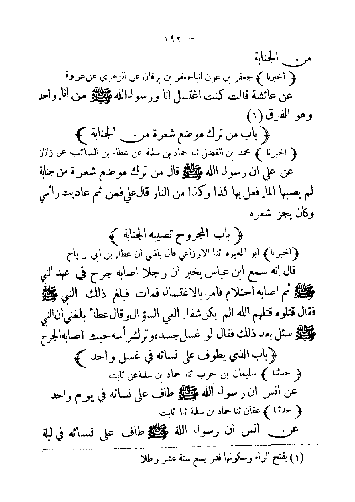 (أخبرنا) جعفر بن عون انبا جعفر بن برقان عن الزهري عن عروة عن عائشة قالت كنت اغتسل انا ورسول الله صلى الله عليه وسلم من اناء واحد وهو الفرق (1)