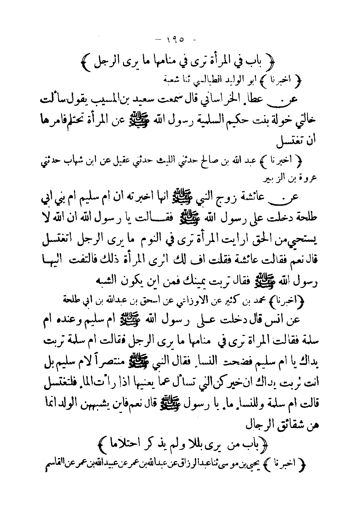 (أخبرنا) عبد الله بن صالح حدثني الليث حدثني عقيل عن ابن شهاب حدثني عروة بن الزبير عن عائشة زوج النبي صلى الله عليه وسلم انها اخبرته ان ام سليم ام بني ابي طلحة دخلت على رسول الله صلى الله عليه وسلم فقالت يا رسول الله ان الله لا يستحيي من الحق ارايت المرأة ترى في النوم ما يرى الرجل اتغتسل قال نعم فقالت عائشة فقلت اف لك اترى المرأة ذلك فالتفت إليها رسول الله صلى الله عليه وسلم فقال تربت يمينك فمن اين يكون الشبه