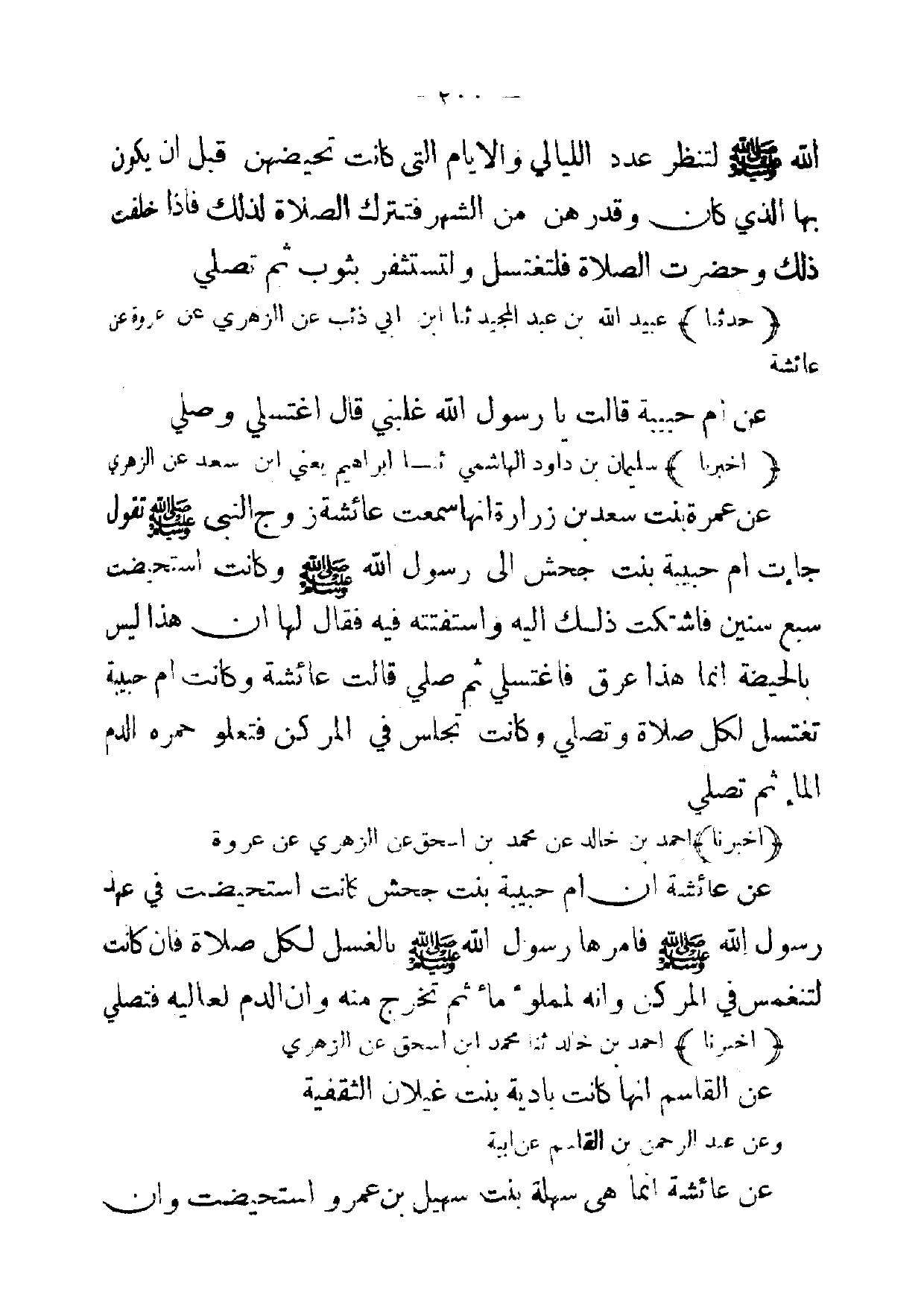 (أخبرنا) سليمان بن داود الهاشمي ثنا ابراهيم يعني ابن سعد عن الزهري عن عمرة بنت سعد بن زرارة انها سمعت عائشة زوج النبي صلى الله عليه وسلم تقول جاءت ام حبيبة بنت جحش إلى رسول الله صلى الله عليه وسلم وكانت استحيضت سبع سنين فاشتكت ذلك إليه واستفتته فيه فقال لها ان هذا ليس بالحيضة انما هذا عرق فاغتسلي ثم صلي قالت عائشة وكانت ام حبيبة تغتسل لكل صلاة وتصلي وكانت تجلس في المركن فتعلو حمره الدم الماء ثم تصلي