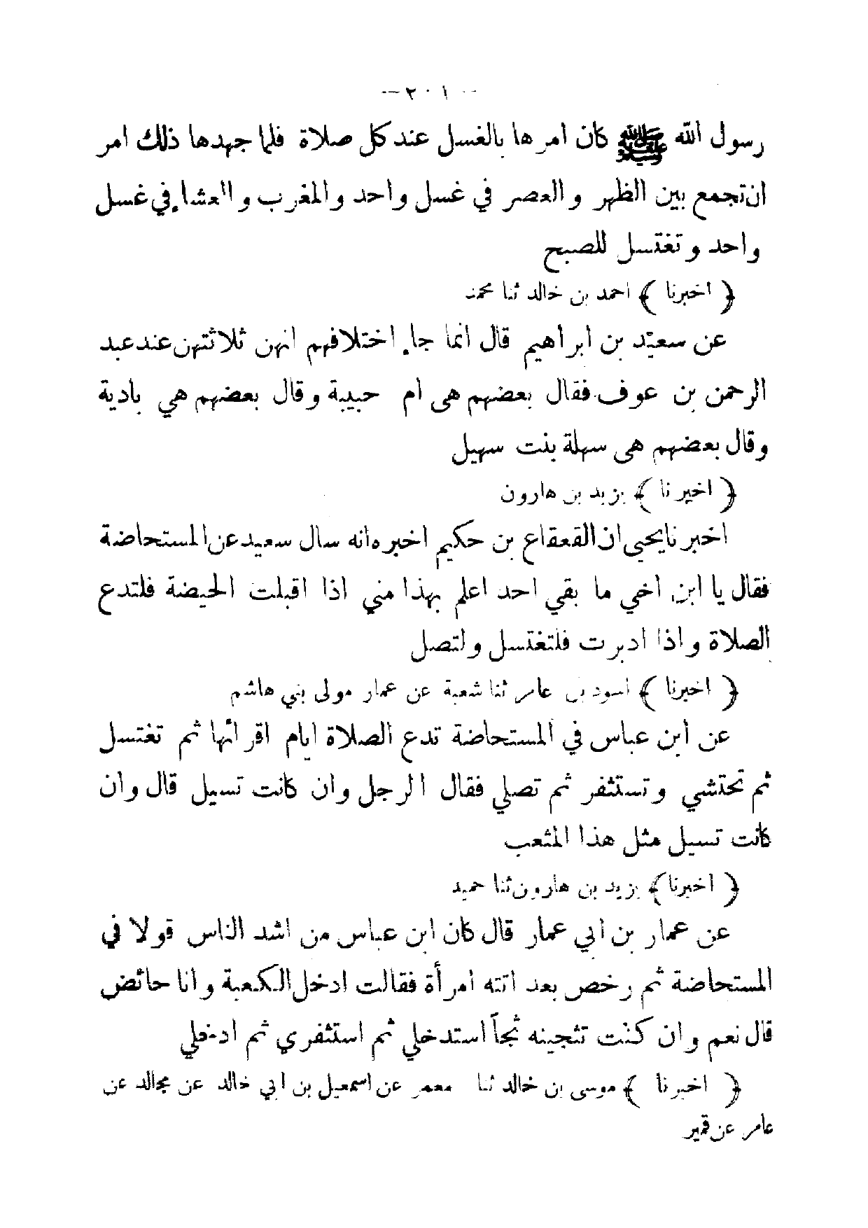 (أخبرنا) اسود بن عامر ثنا شعبة عن عمار مولى بني هاشم عن ابن عباس في المستحاضة تدع الصلاة ايام اقرائها ثم تغتسل ثم تحتشي وتستثفر ثم تصلي فقال الرجل وان كانت تسيل قال وان كانت تسيل مثل هذا المثعب