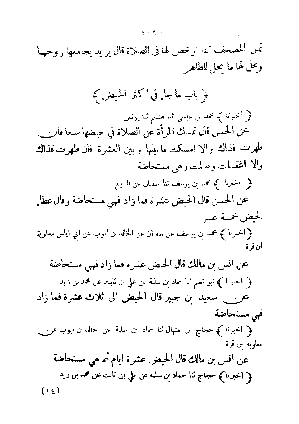 (أخبرنا) محمد بن يوسف عن سفيان عن الخالد بن ايوب عن ابي اياس معاوية ابن قرة عن انس بن مالك قال الحيض عشره فما زاد فهي مستحاضة