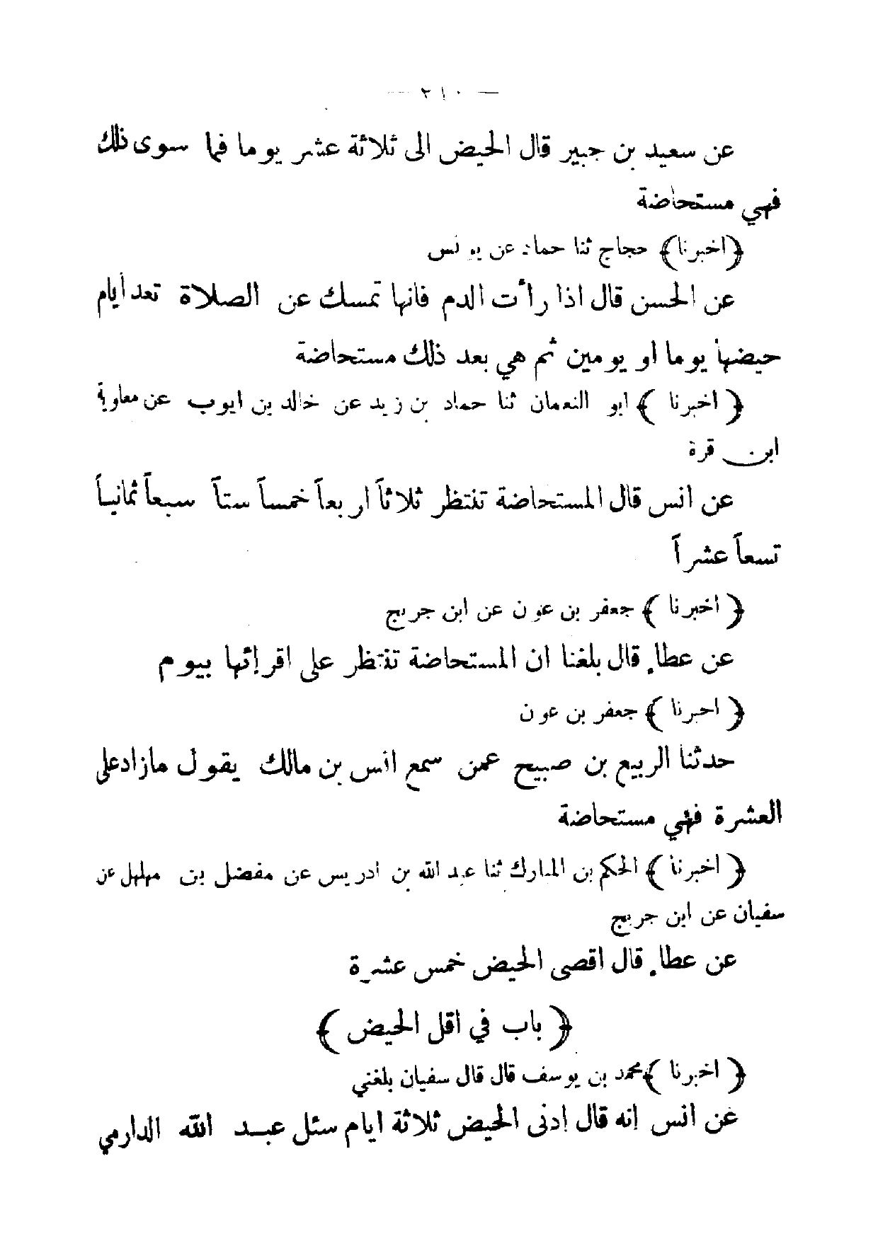 (أخبرنا) محمد بن يوسف قال قال سفيان بلغني عن انس انه قال ادنى الحيض ثلاثة ايام سئل عبد الله الدرامي