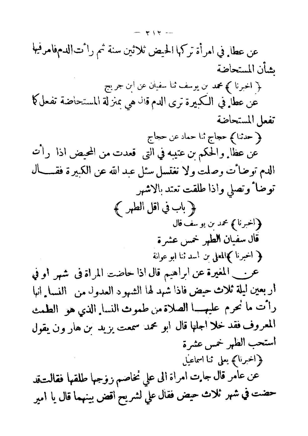 [ 212 ] عن عطاء في امرأة تركها الحيض ثلاثين سنة ثم رأت الدم فامر فيها بشأن المستحاضة