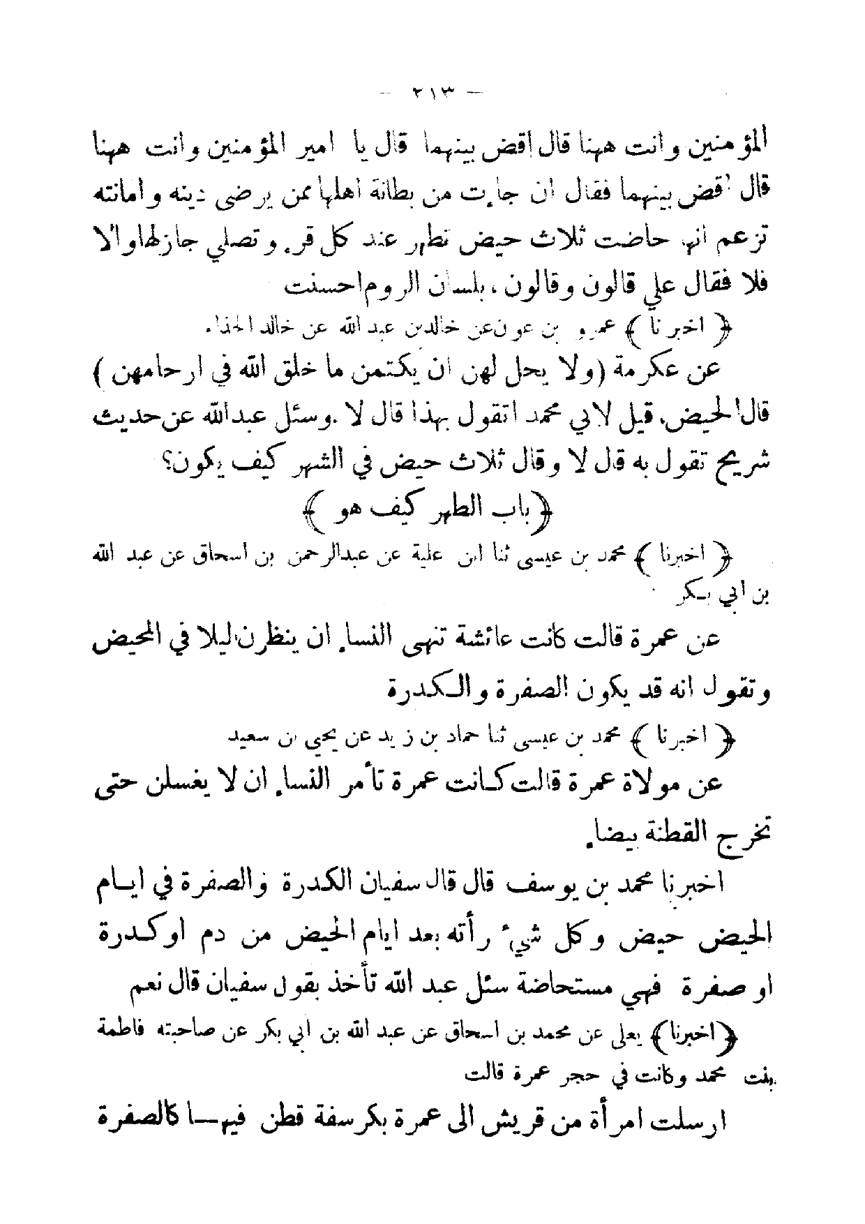 (أخبرنا) محمد بن عيسى ثنا حماد بن زيد عن يحيى بن سعيد عن مولاة عمرة قالت كانت عمرة تأمر النساء ان لا يغسلن حتى تخرج القطنة بيضاء اخبرنا محمد بن يوسف قال قال سفيان الكدرة والصفرة في ايام الحيض حيض وكل شئ رأته بعد ايام الحيض من دم أو كدرة أو صفرة فهي مستحاضة سئل عبد الله تأخذ بقول سفيان قال نعم