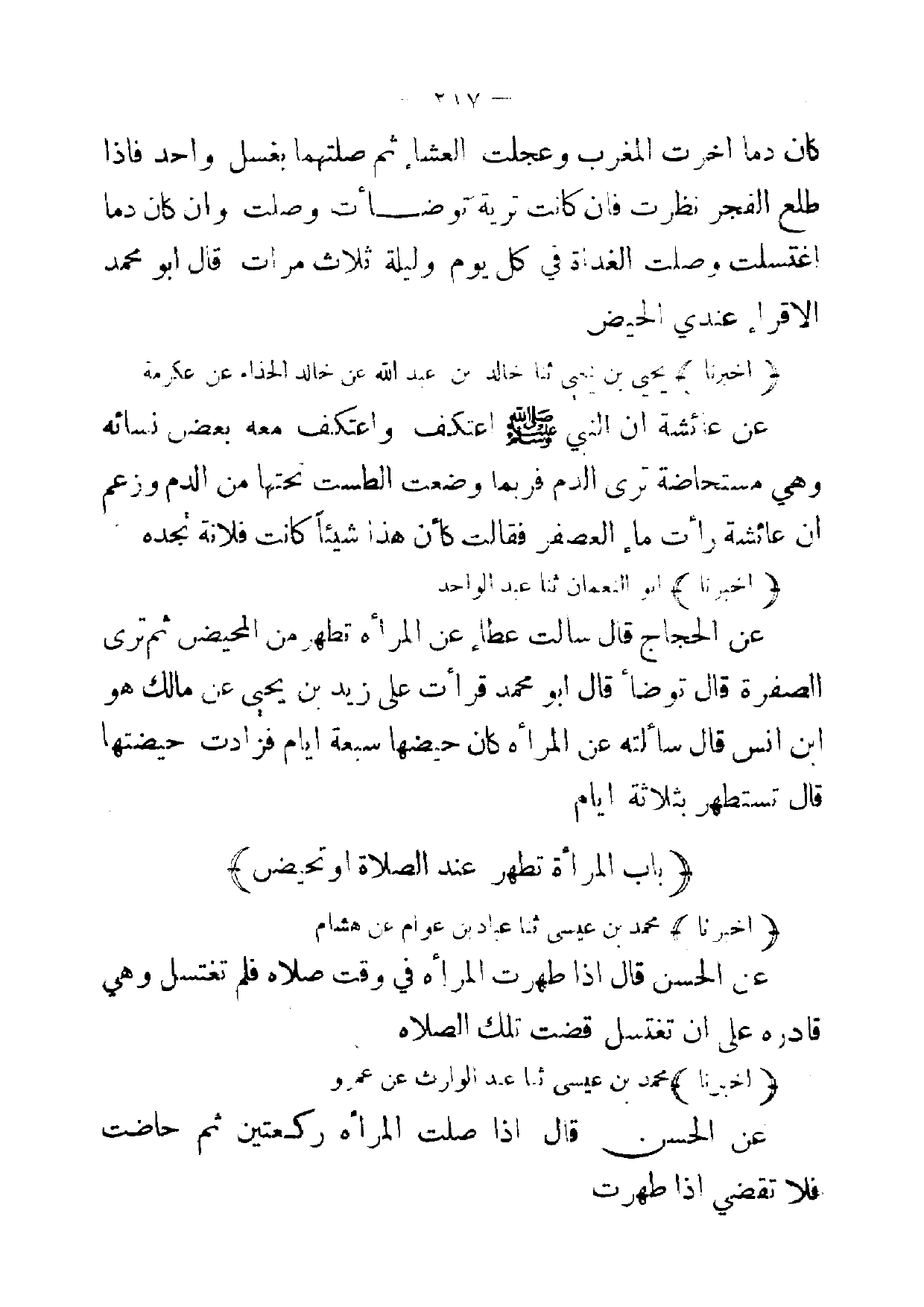 (أخبرنا) أبو النعمان ثنا عبد الواحد عن الحجاج قال سالت عطاء عن المرأة تطهر من المحيض ثم ترى الصفرة قال توضأ قال أبو محمد قرأت على زيد بن يحيى عن مالك هو ابن انس قال سألته عن المرأه كان حيضها سبعة ايام فزادت حيضتها قال تستطهر بثلاثة ايام