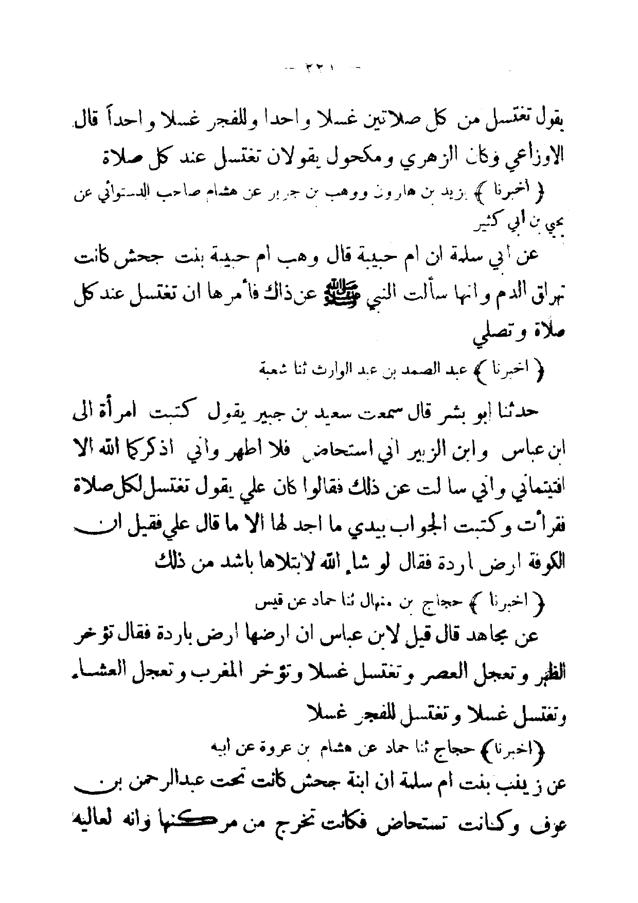 (أخبرنا) عبد الصمد بن عبد الوارث ثنا شعبة حدثنا أبو بشر قال سمعت سعيد بن جبير يقول كتبت امرأة إلى ابن عباس وابن الزبير اني استحاض فلا اطهر واني اذكر كما الله الا افتيتماني واني سالت عن ذلك فقالوا كان علي يقول تغتسل لكل صلاة فقرأت وكتبت الجواب بيدي ما اجد لها الا ما قال علي فقيل ان الكوفة ارض اردة فقال لو شاء الله لا بتلاها باشد من ذلك