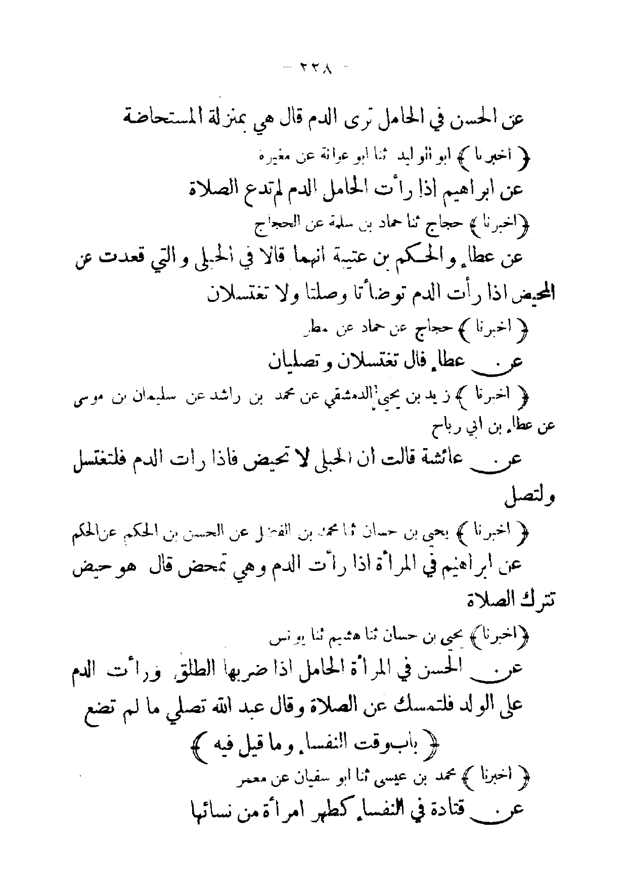 (أخبرنا) زيد بن يحيى الدمشقي عن محمد بن راشد عن سليمان بن موسى عن عطاء بن ابي رباح عن عائشة قالت ان الحبلى لا تحيض فإذا رات الدم فلتغتسل ولتصل