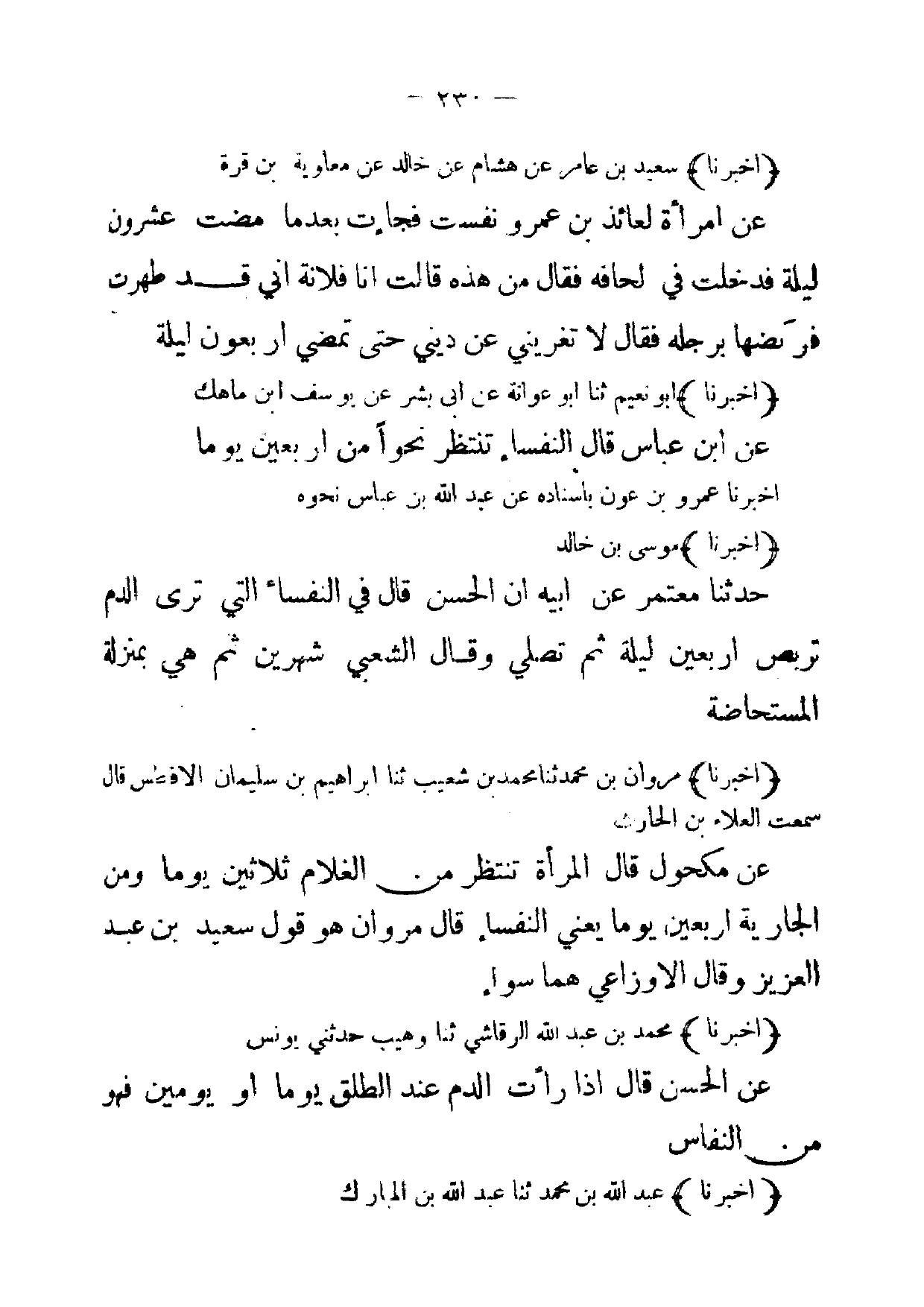 (أخبرنا) سعيد بن عامر عن هشام عن خالد عن معاوية بن قرة عن امرأة لعائذ بن عمرو نفست فجاءت بعدما مضت عشرون ليلة فدخلت في لحافه فقال من هذه قالت انا فلانة اني قد طهرت فربضها برجله فقال لا تغريني عن ديني حتى تمضي اربعون ليلة