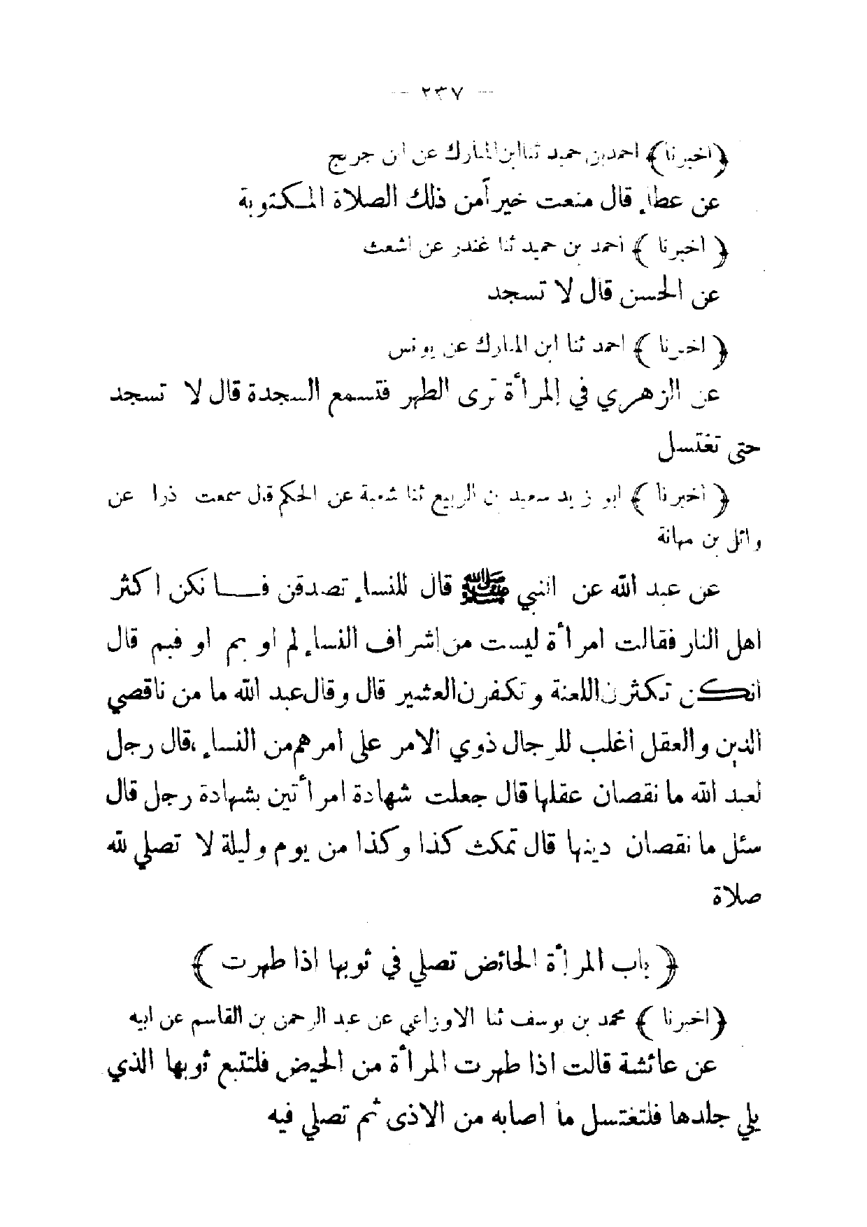 (أخبرنا) أبو زيد سعيد بن الربيع ثنا شعبة عن الحكم قال سمعت ذرا عن وائل بن مهانة عن عبد الله عن النبي صلى الله عليه وسلم قال للنساء تصدقن فانكن اكثر اهل النار فقالت امرأة ليست من اشراف النساء لم أو بم أو فبم قال انكن تكثرن اللعنة وتكفرن العشير قال وقال عبد الله ما من ناقصي الدين والعقل اغلب للرجال ذوي الامر على امر هم من النساء ، قال رجل لعبدالله ما نقصان عقلها قال جعلت شهادة امرأتين بشهادة رجل قال سئل ما نقصان دينها قال تمكث كذا وكذا من يوم وليلة لا تصلي الله صلاة