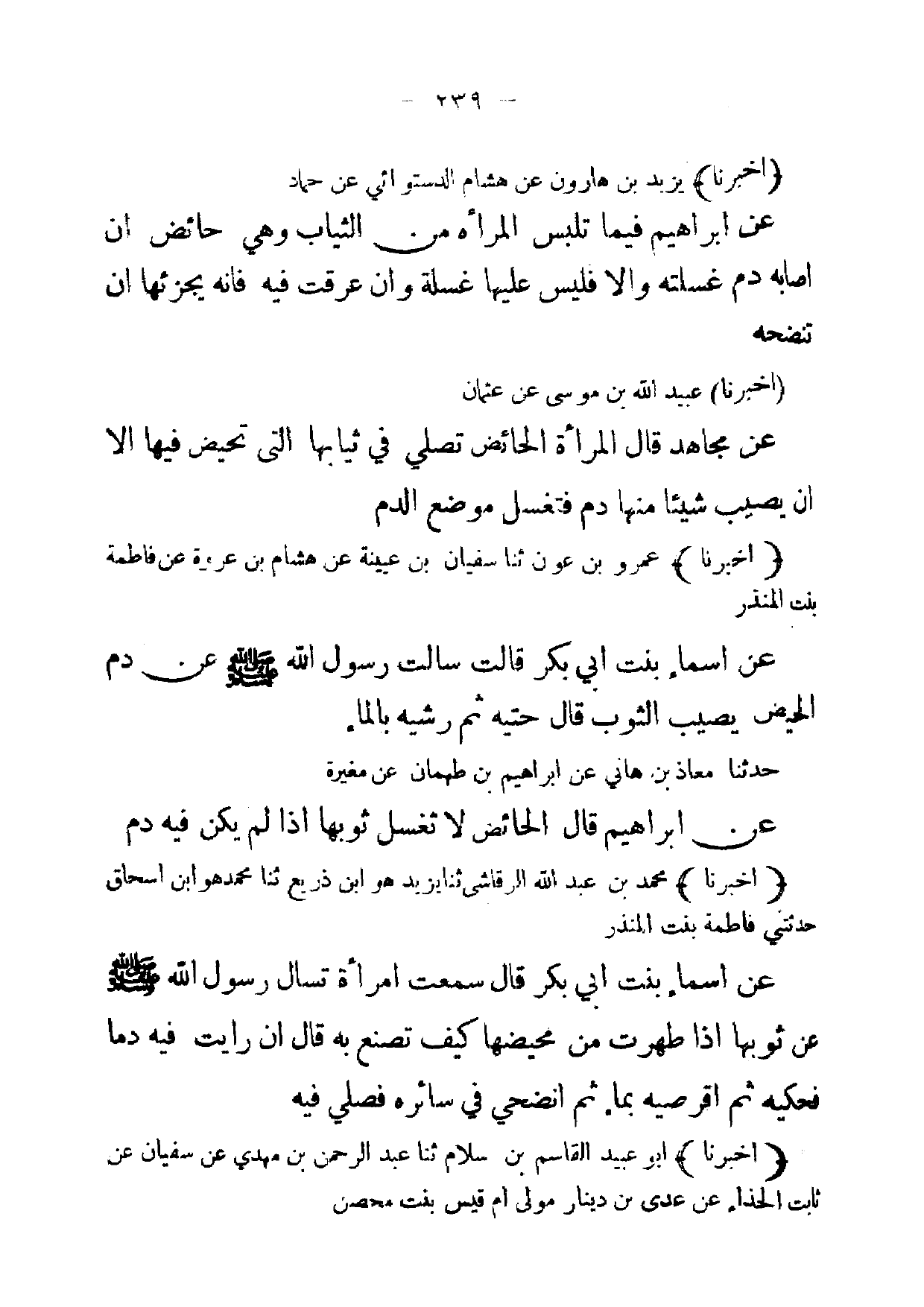 (أخبرنا) عمرو بن عون ثنا سفيان بن عيينة عن هشام بن عروة عن فاطمة بنت المنذر عن اسماء بنت ابي بكر قالت سالت رسول اله صلى الله عليه وسلم عن دم الحيض يصيب الثوب قال حتيه ثم رشيه بالماء حدثنا معاذ بن هاني عن ابراهيم بن طهمان عن مغيرة عن ابراهيم قال الحائض لا ثغسل ثوبها إذا لم يكن فيه دم