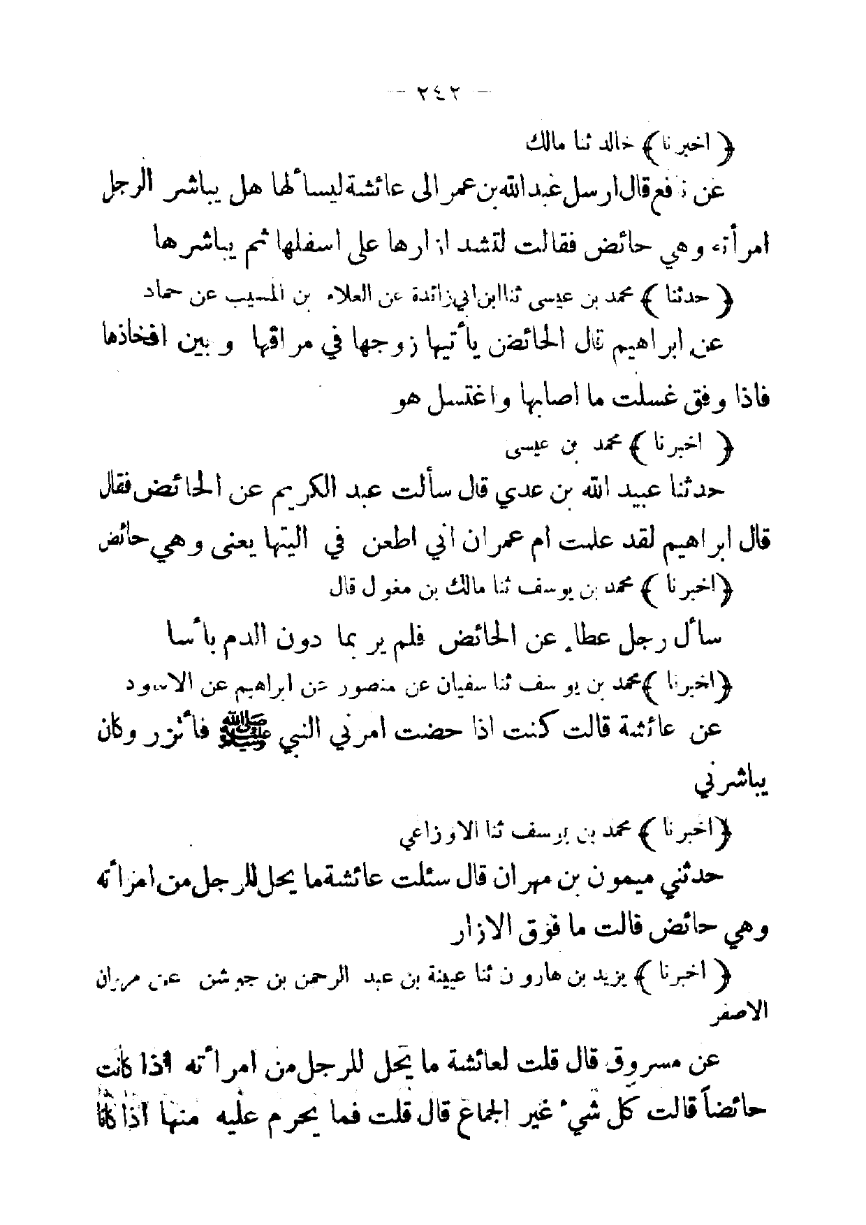 (أخبرنا) خالد ثنا مالك عن نافع قال ارسل عبد الله بن عمر إلى عائشة ليسألها هل يباشر الرجل امرأته وهي حائض فقالت لتشد ازارها على اسفلها ثم يباشرها