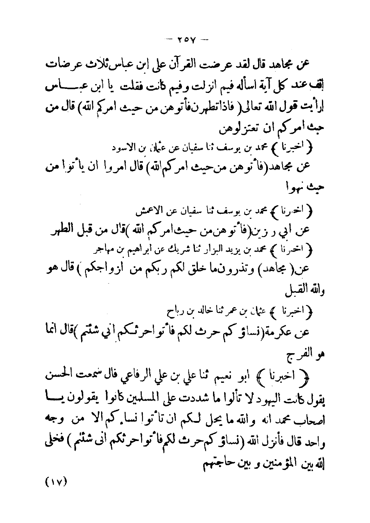 [ 257 ] عن مجاهد قال لقد عرضت القرآن على ابن عباس ثلاث عرضات اقف عند كل آية اسأله فيم انزلت وفيم كانت فقلت يا ابن عباس ارأيت قول الله تعالى (فإذا تطهرن فأتوهن من حيث امركم الله) قال من حيث امر كم ان تعتزلوهن
