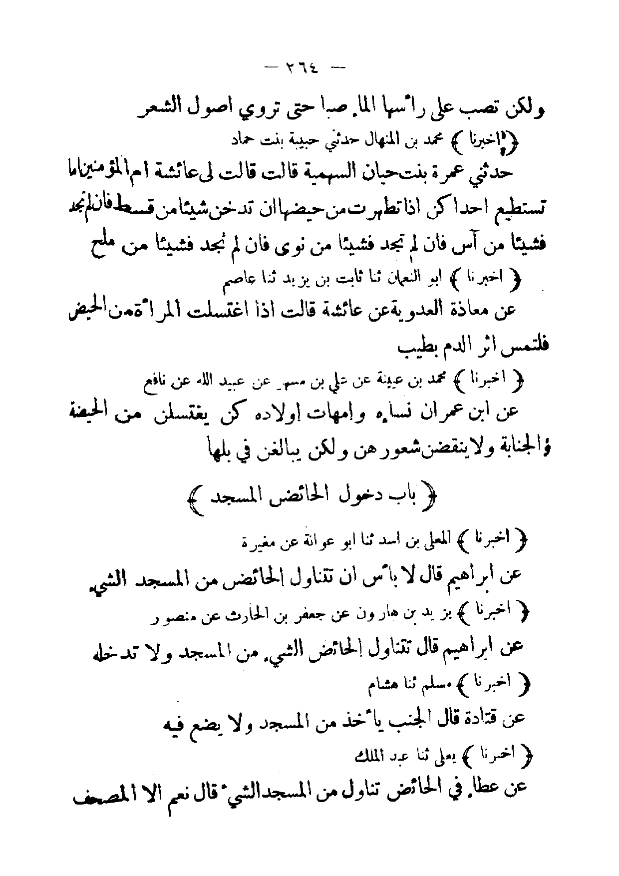 (أخبرنا) المعلى بن اسد ثنا أبو عوانة عن مغيرة عن ابراهيم قال لا بأس ان تتناول الحائض من المسجد الشئ