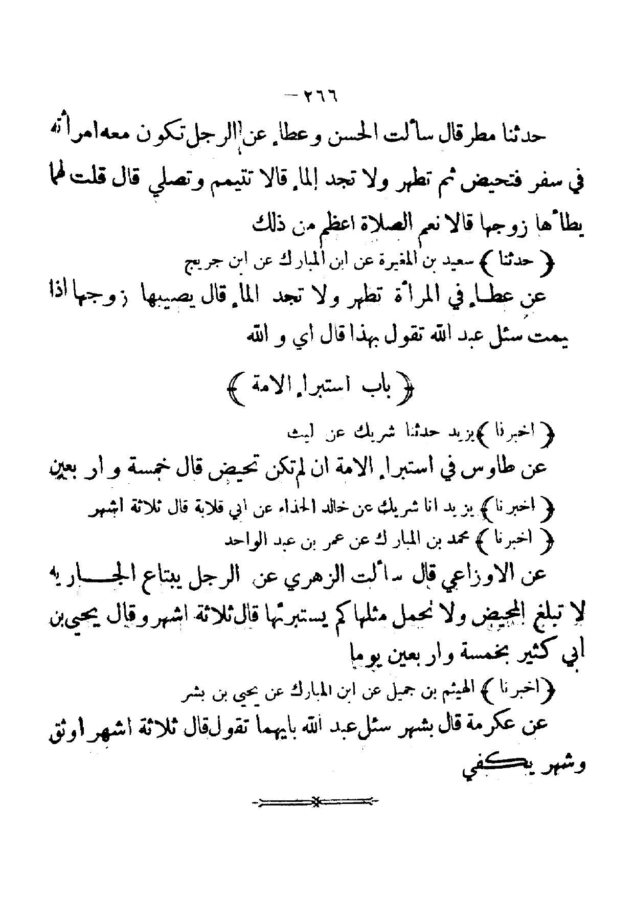 [ 266 ] حدثنا مطر قال سألت الحسن وعطاء عن الرجل تكون معه امرأته في سفر فتحيض ثم تطهر ولا تجد الماء قالا تتيمم وتصلي قال قلت لهما يطأها زوجها قالا نعم الصلاة اعظم من ذلك