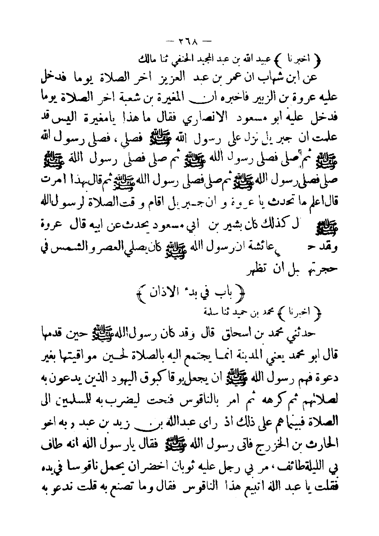 (أخبرنا) محمد بن حميد ثنا سلمة حدثني محمد بن اسحاق قال وقد كان رسول الله صلى الله عليه وسلم حين قدمها قال أبو محمد يعني المدينة انما يجتمع إليه بالصلاة لحين مواقيتها بغير دعوة فهم رسول الله صلى الله عليه وسلم ان يجعل بوقا كبوق اليهود الذين يدعون به لصلاتهم ثم كرهه ثم امر بالناقوس فنحت ليضرب به للمسلمين إلى الصلاة فبينما هم على ذلك إذا راى عبد الله بن زيد بن عبد ربه اخو الحارث بن الخزرج فاتى رسول الله صلى الله عليه وسلم فقال يا رسول الله انه طاف بي الليلة طائف ، مربي رجل عليه ثوبان اخضر ان يحمل ناقوسا في يده فقلت يا عبد الله اتبيع هذا الناقوس فقا وما تصنع به قلت ندعو به