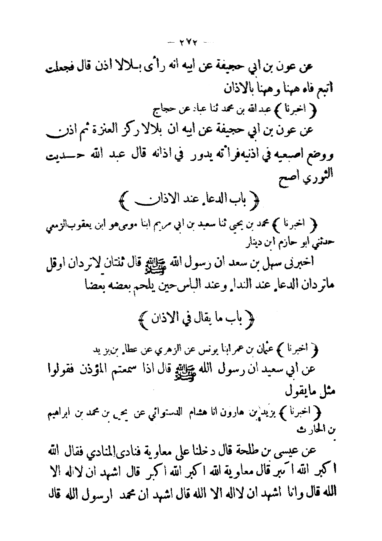 (أخبرنا) عبد الله بن محمد ثنا عباد عن حجاج عن عون بن ابي حجيفة عن ابيه ان بلالا ركز العنزة ثم اذن ووضع اصبعيه في اذنيه فرأته يدور في اذانه قال عبد الله حديث الثوري اصح