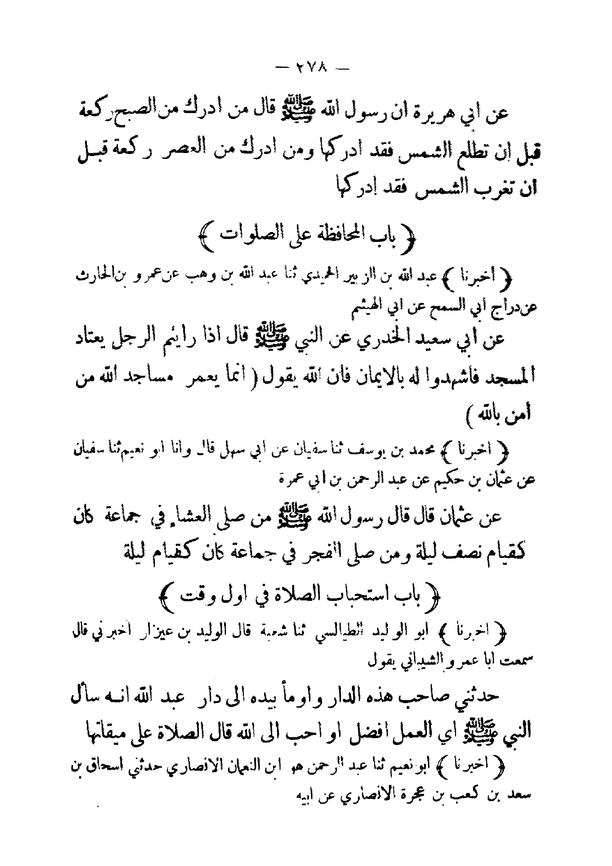 [ 278 ] عن ابي هريرة ان رسول الله صلى الله عليه وسلم قال من ادرك من الصبح ركعة قبل ان تطلع الشمس فقد ادركها ومن ادرك من العصر ركعة قبل ان تغرب الشمس فقد ادركها