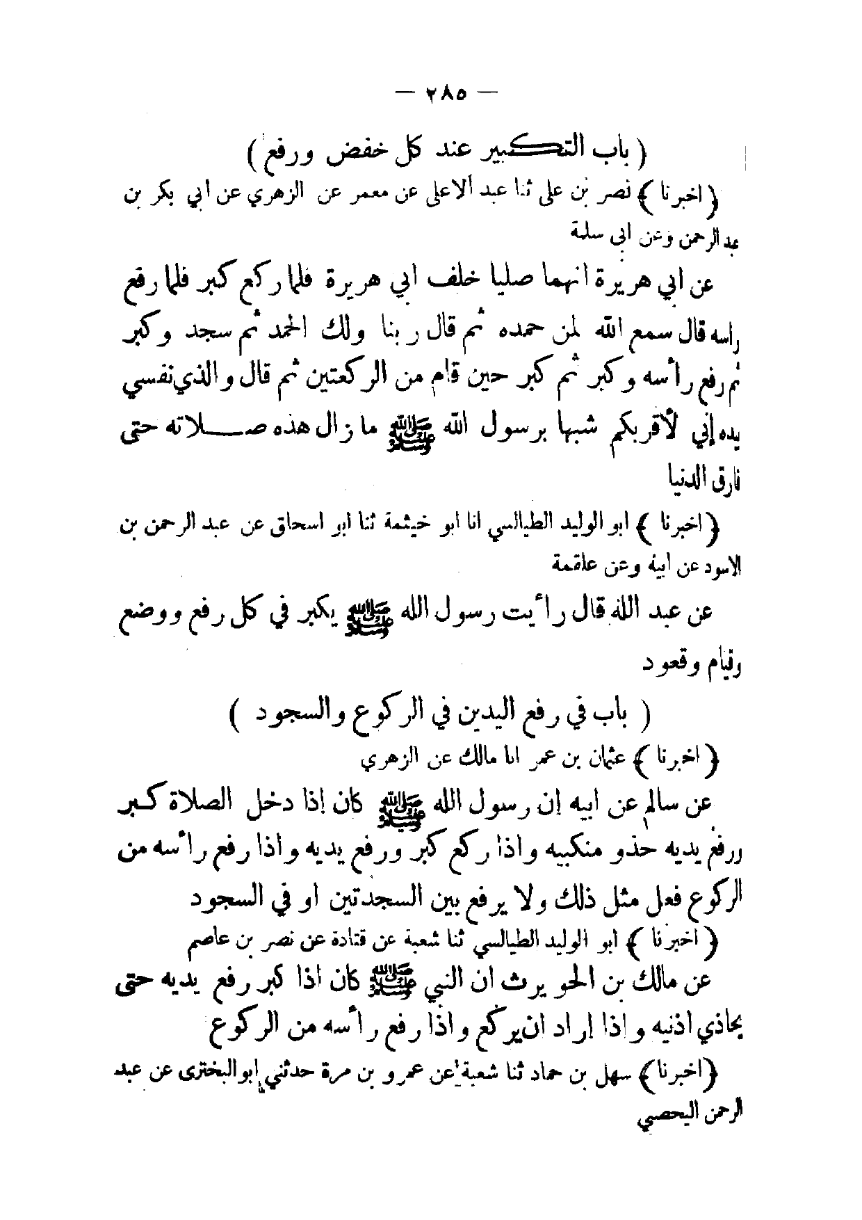 (أخبرنا) عثمان بن عمر انا مالك عن الزهري عن سالم عن ابيه ان رسول الله صلى الله عليه وسلم كان إذا دخل الصلاة كبر ورفع يديه حذو منكبيه وإذا ركع كبر ورفع يديه وإذا رفع رأسه من الركوع فعل مثل ذلك ولا يرفع بين السجدتين أو في السجود