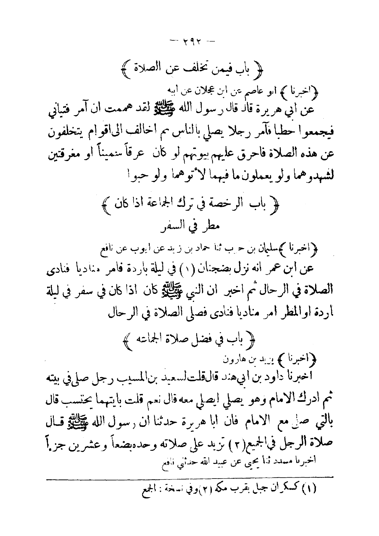 (أخبرنا) سليمان بن حرب ثنا حماد بن زيد عن ايوب عن نافع عن ابن عمر انه نزل بضجنان (1) في ليلة باردة فامر مناديا فنادى الصلاة في الرجال ثم اخبر ان النبي صلى الله عليه وسلم كان إذا كان في سفر في ليلة اردة أو المطر امر مناديا فنادى فصلى الصلاة في الرجال