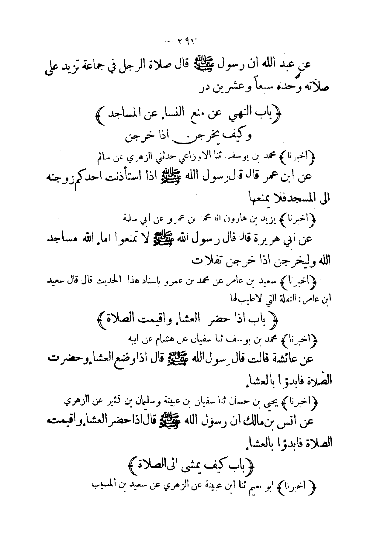 (أخبرنا) محمد بن يوسف ثنا الاوزاعي حدثني الزهري عن سالم عن ابن عمر قال قال رسول الله صلى الله عليه وسلم إذا استأذنت احدكم زوجته إلى المسجد فلا يمنعها