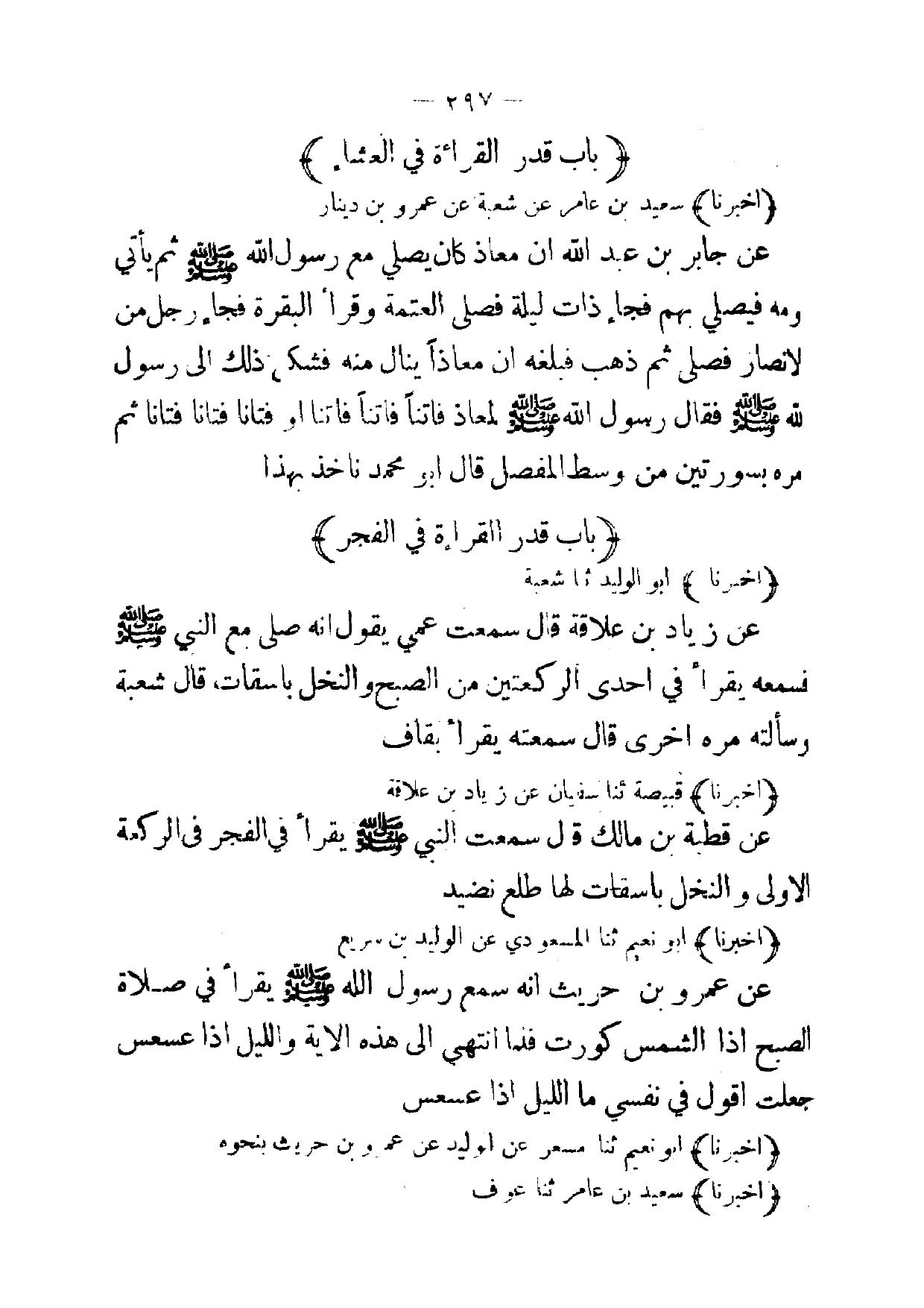 (أخبرنا) سعيد بن عامر عن شعبة عن عمرو بن دينار عن جابر بن عبد الله ان معاذ كان يصلي مع رسول الله صلى الله لعيه وسلم ثم يأتي قومه فيصلي بهم فجاء ذات ليلة فصلى العتمة وقرأ البقرة فجاء رجل من الانصار فصلى ثم ذهب فبلغه ان معاذا ينال منه فشكى ذلك إلى رسول الله صلى الله عليه وسلم فقال رسول الله صلى الله عليه وسلم لمعاذ فاتنا فاتنا أو فتانا فتانا فتانا ثم امره بسورتين من وسط المفصل قال أبو محمد ناخذ بهذا (بباب قدر القرإة في الفجر)