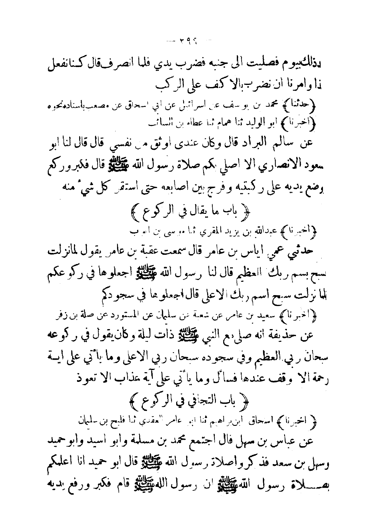 [ 299 ] بعد ذلك بيوم فصليت إلى جنبه فضرب يدي فلما انصرف قال كنا نفعل هذا وامرنا ان نضرب بالاكف على الركب