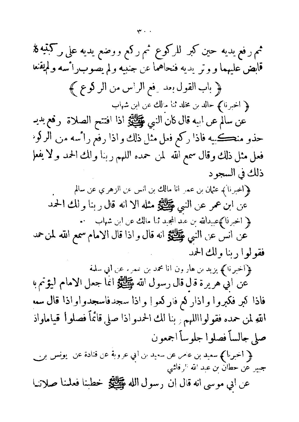(أخبرنا) خالد بن مخلد ثنا مالك عن ابن شهاب عن سالم عن ابيه قال كان النبي صلى الله عليه وسلم إذا افتتح الصلاة رفع يدية خذو منكبيه فإذا ركع فعل مثل ذلك وإذا رفع رأسه من الركوع فعل مثل ذلك وقال سمع الله لمن حمده اللهم ربنا ولك الحمد ولا يفعل ذلك في السجود