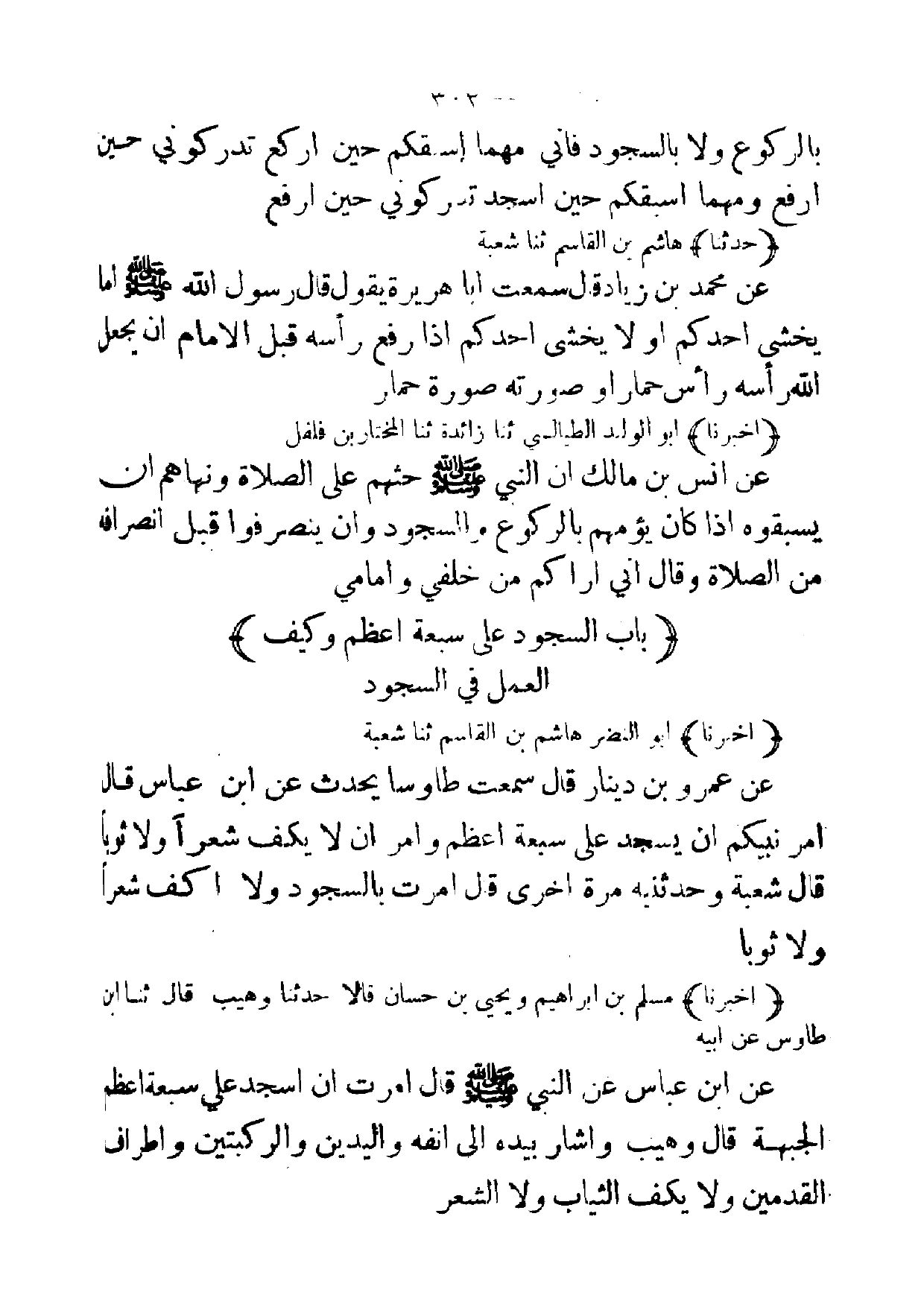 (أخبرنا) ابو النضر هاشم بن القاسم ثنا شعبة عن عمرو بن دينار قال سمعت طاوسا يحدث عن ابن عباس قال امر نبيكم ان يسجد على سبعة اعظم وامر ان لا يكف شعرا ولا ثوبا قال شعبة وحدثنيه مرة اخرى قال امرت بالسجود ولا اكف شعرا ولا ثوبا