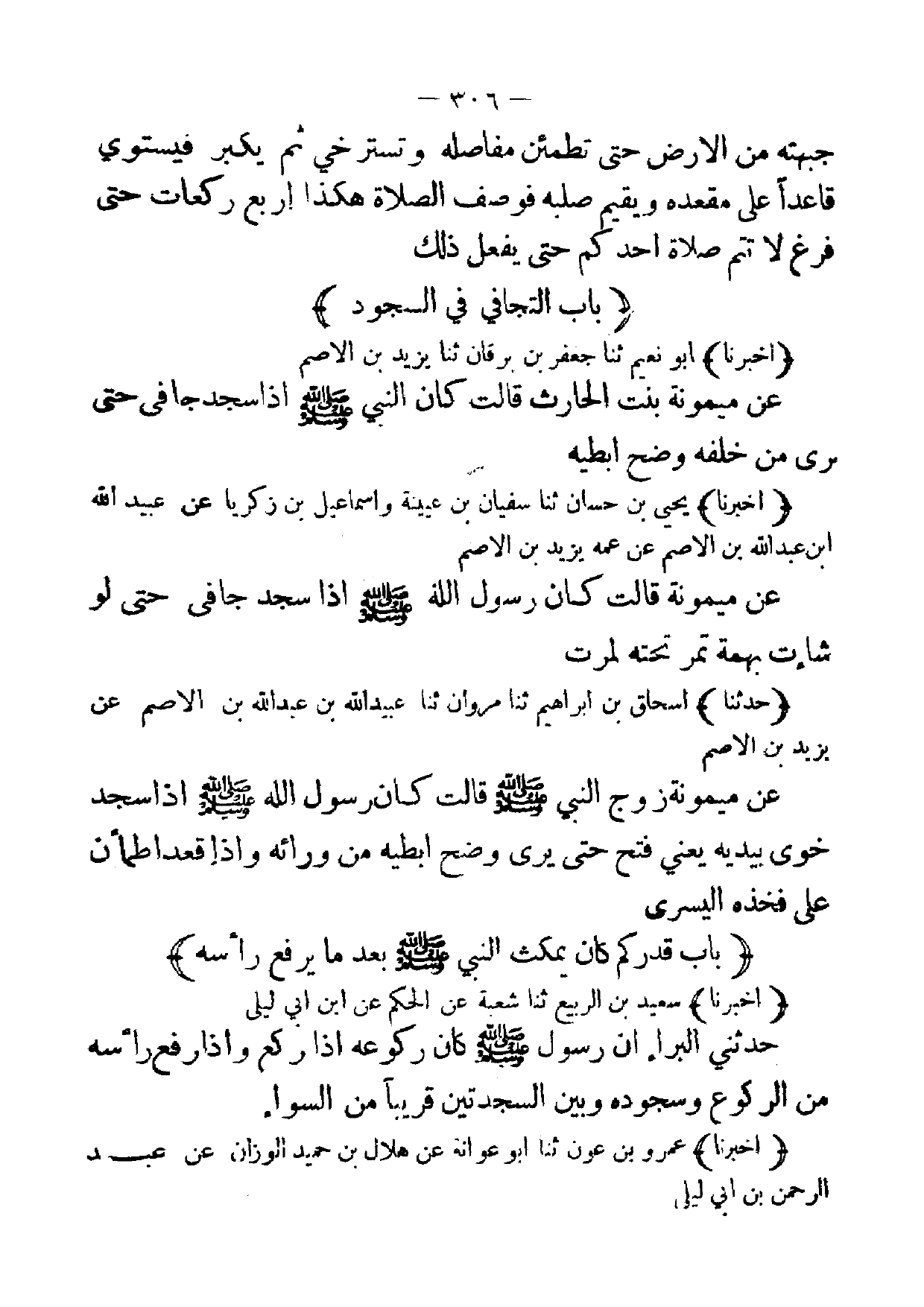(أخبرنا) أبو نعيم ثنا جعفر بن برقان ثنا يزيد بن الاصم عن ميمونة بنت الحارث قالت كان النبي صلى الله عليه وسلم إذا سجد جافى حتى برى من خلفه وضح ابطيه