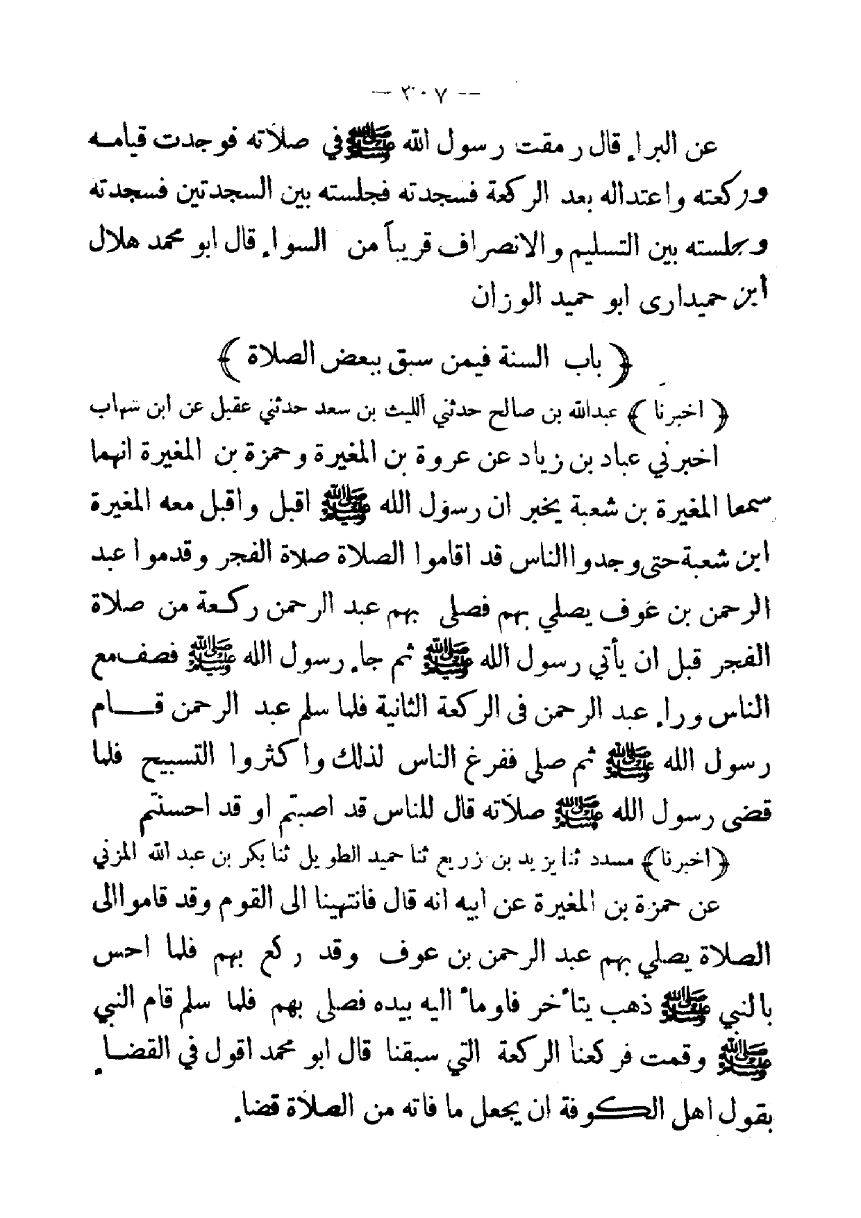[ 307 ] عن البراء قال رمقت رسول الله صلى الله عليه وسلم في صلاته فوجدت قيامه وركعته واعتداله بعد الركعة فسجدته فجلسته بين السجدتين فسجدته وجلسته بين التسليم والانصراف قريبا من السواء قال أبو محمد هلال ابن حميدارى ابو حميد الوزان