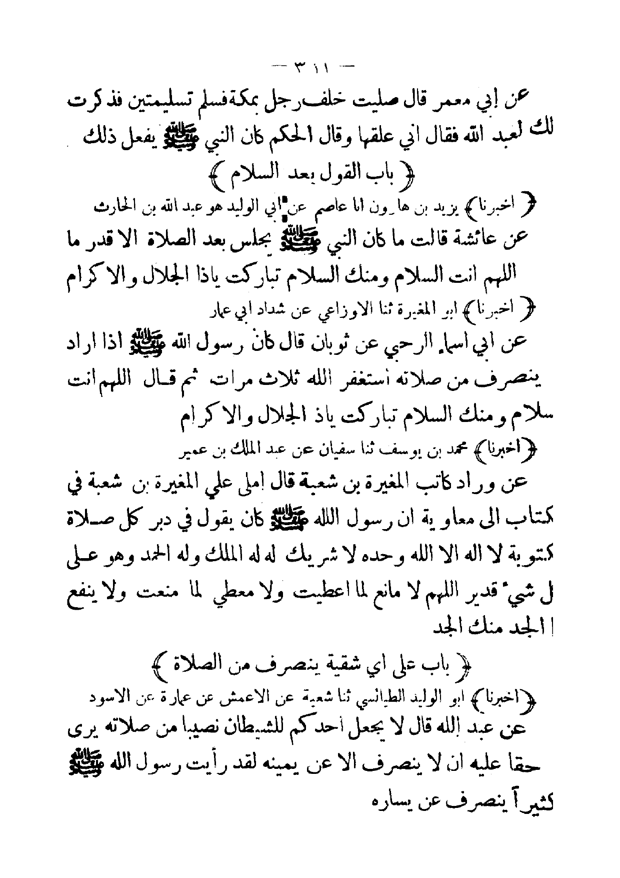 [311] عن ابي معمر قال صليت خلف رجل بمكة فسلم تسليمتين فذكرت ذلك لعبد الله فقال اني علقها وقال الحكم كان النبي صلى الله عليه وسلم يفعل ذلك