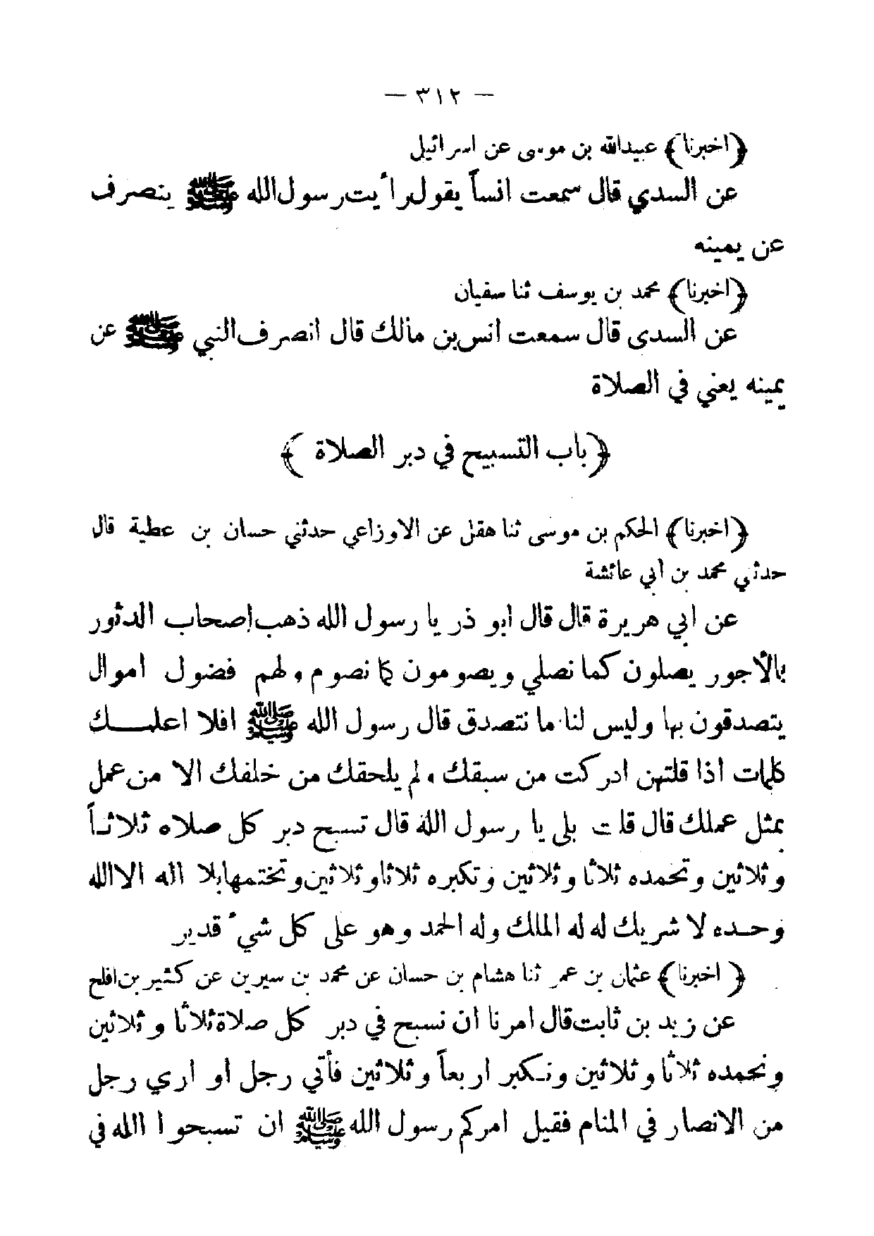 (أخبرنا) عبيدالله بن موسى عن اسرائيل عن السدي قال سمعت انسا يقول رأيت رسو الله صلى الله عليه وسلم ينصرف عن يمينه