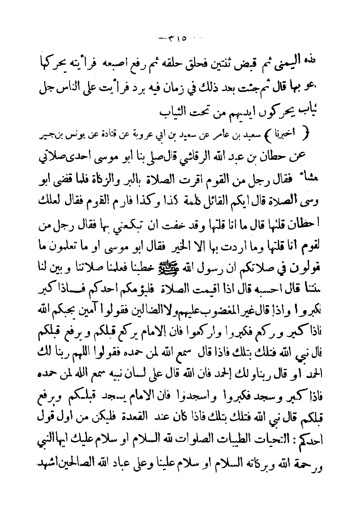 (أخبرنا) سعيد بن عامر عن سعيد بن ابي عروبة عن قتادة عن يونس بن جبير عن حطان بن عبد الله الرقاشي قال صلى بنا أبو موسى احدى صلاتي العشاء فقال رجل من القوم اقرت الصلاة بالبر والزكاة فلما قضى أبو موسى الصلاة قال ايكم القائل كلمة كذا وكذا فارم القوم فقال لعلك يا حطان قلتها قال ما انا قلتها وقد خفت ان تبكعني بها فقال رجل من القوم انا قلتها وما اردت بها الا الخير فقال أبو موسى أو ما تعلمون ما تقولون في صلاتكم ان رسول الله صلى الله عليه وسلم خطبنا فعلمنا صلاتنا وبين لنا سنتنا قال احسبه قال إذا اقيمت الصلاة فليؤمكم احدكم فإذا كبر فكبروا وإذا قال غير المغضوب عليهم ولا الضالين فقولوا آمين يحبكم الله فإذا كبر وركع فكبروا واركعوا فان الامام يركع قبلكم ويرفع قبلكم قال نبي الله فتلك بتلك فإذا قال سمع الله لمن حمده فقولوا اللهم ربنا لك الحمد أو قال ربنا ولك الحمد فان الله قال على السان نبيه سمع الله لمن حمده فإذا كبر وسجد فكبروا واسجدوا فان الامام يسجد قبلكم ويرفع قبلكم قال نبي الله فتلك بتلك فإذا كان عند القعدة فليكن من اول قول احدكم : التحيات الطيبات الصلوات لله السلام أو سلام عليك ايها النبي ورحمة الله وبركاته السلام أو سلام علينا وعلى عباد الله الصالحين اشهد