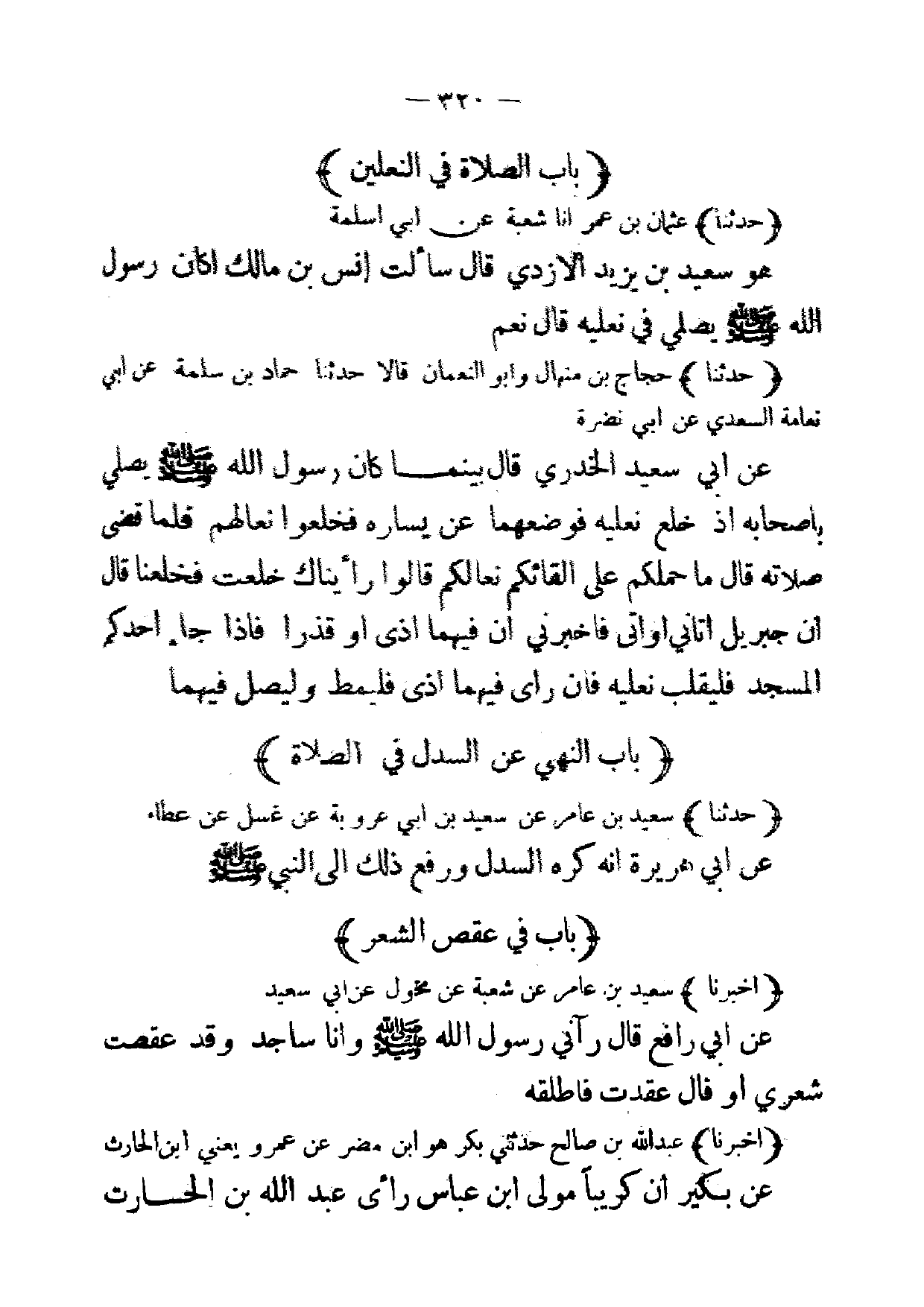 (حدثنا) عثمان بن عمر انا شعبة عن ابي اسلمة هو سعيد بن يزيد الازدي قال سألت انس بن مالك اكان رسول الله صلى الله عليه وسلم يصلي في نعليه قال نعم
