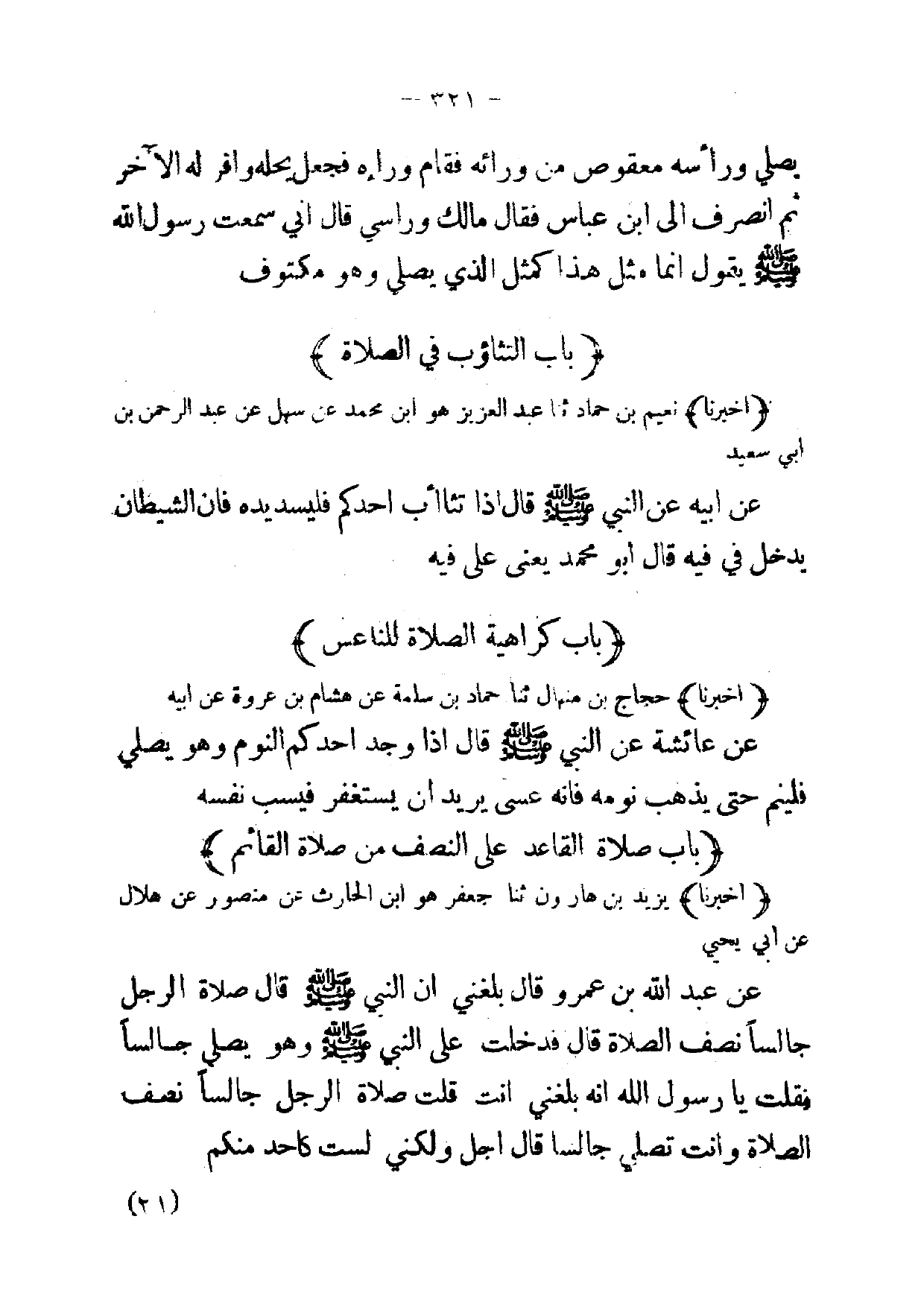 [ 321 ] يصلي ورأسه معقوص من روائه فقام ورإه فجعل يحله واقر له الآخر ثم انصرف إلى ابن عباس فقال مالك وراسي قال اني سمعت رسول الله صلى الله عليه وسلم يقول انما مثل هذا كمثل الذي يصلي وهو مكتوف