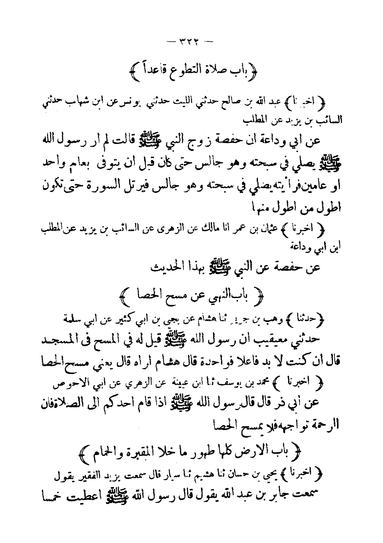 (أخبرنا) عبد الله بن صالح حدثني الليث حدثني يونس عن ابن شهاب حدثني السائب بن يزيد عن المطلب عن ابي وداعة ان حفصة زوج النبي صلى الله عليه وسلم قالت لم ار رسول الله صلى الله عليه وسلم يصلي في سبحته وهو جالس حتى كان قبل ان يتوفى بعام واحد أو عامين فرأيته يصلي في سبحته وهو جالس فيرتل السورة حتى تكون اطول من اطول منها